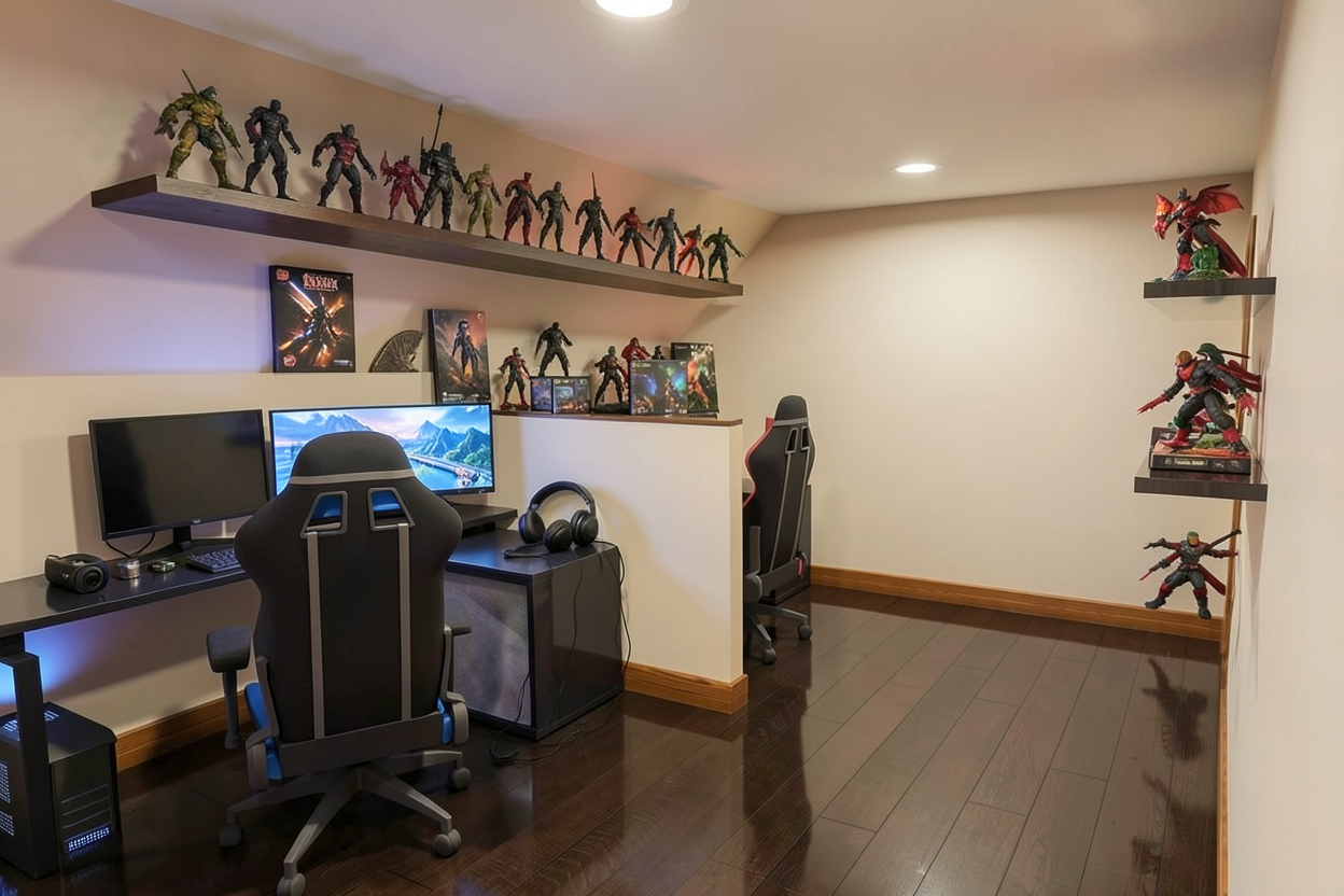 add a headphone set to the desk and some video games and action figures to the floating shelves