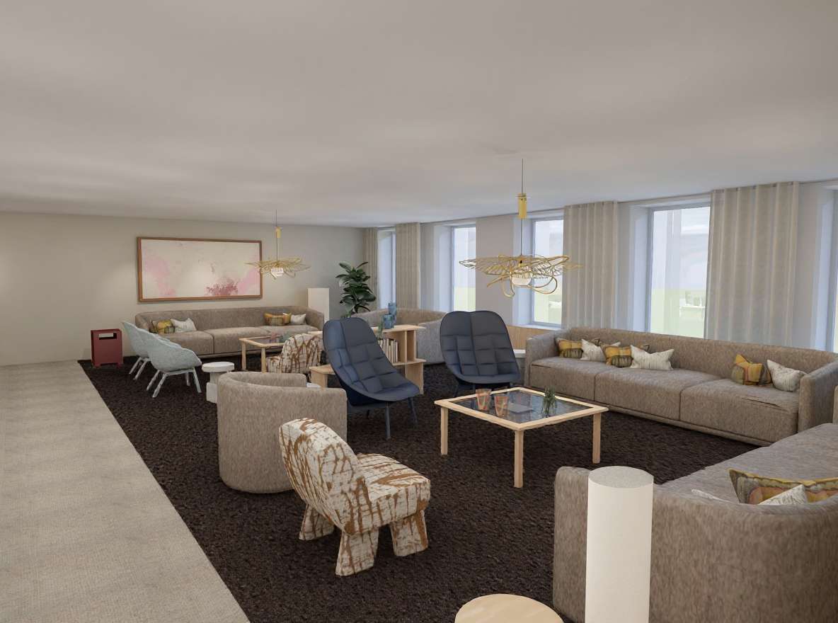 make it more photo realistic and nice make the rug in one coloure dark beige light brown no pattern nice now kamke the pendant lights shine a bit more but keep it a bright daytime picture put a large picture in a wooden frame on the back wall it should be an abstract motif in beige light pink and brown and the rug lighter in color more beige now add some coffee table books adn dekor on the table the curtaisn can be a shade darker but still sheer beige