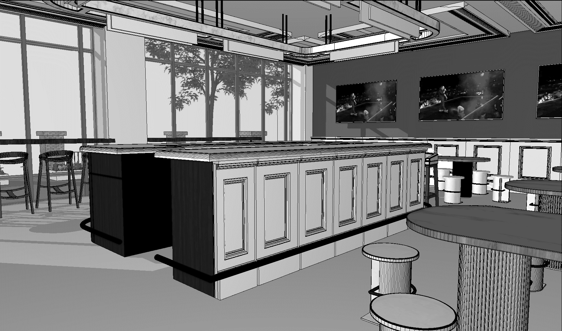 interior shot tv screens with a sport events on the walls giant windows bright sunny day outside the windows