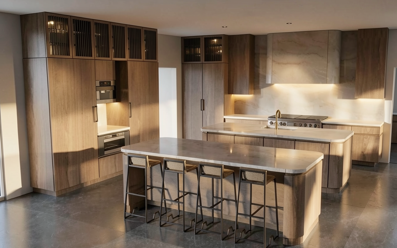 create a modern luxe top down rendered floor plan for real estate marketing maintain the exact layout dimensions walls doors windows and all existing text labels use a clean white and soft warm grey background light oak timber flooring in living areas luxury off white carpet in bedroom areas large format light stone tiles in wet areas carara marble finish on benchtops and vanities and subtle area rugs add contemporary high end furniture lighting and styling that feels sophisticated but not cluttered ensure clear linework legible room names and annotations and an overall bright polished brochure ready look add a hamptons vibe