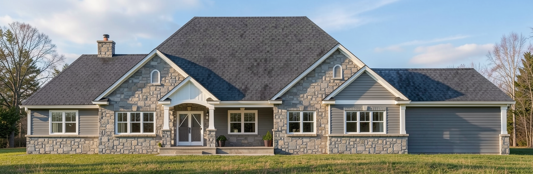 create color rendering gray stone gray siding dark gray shingle roof white trim