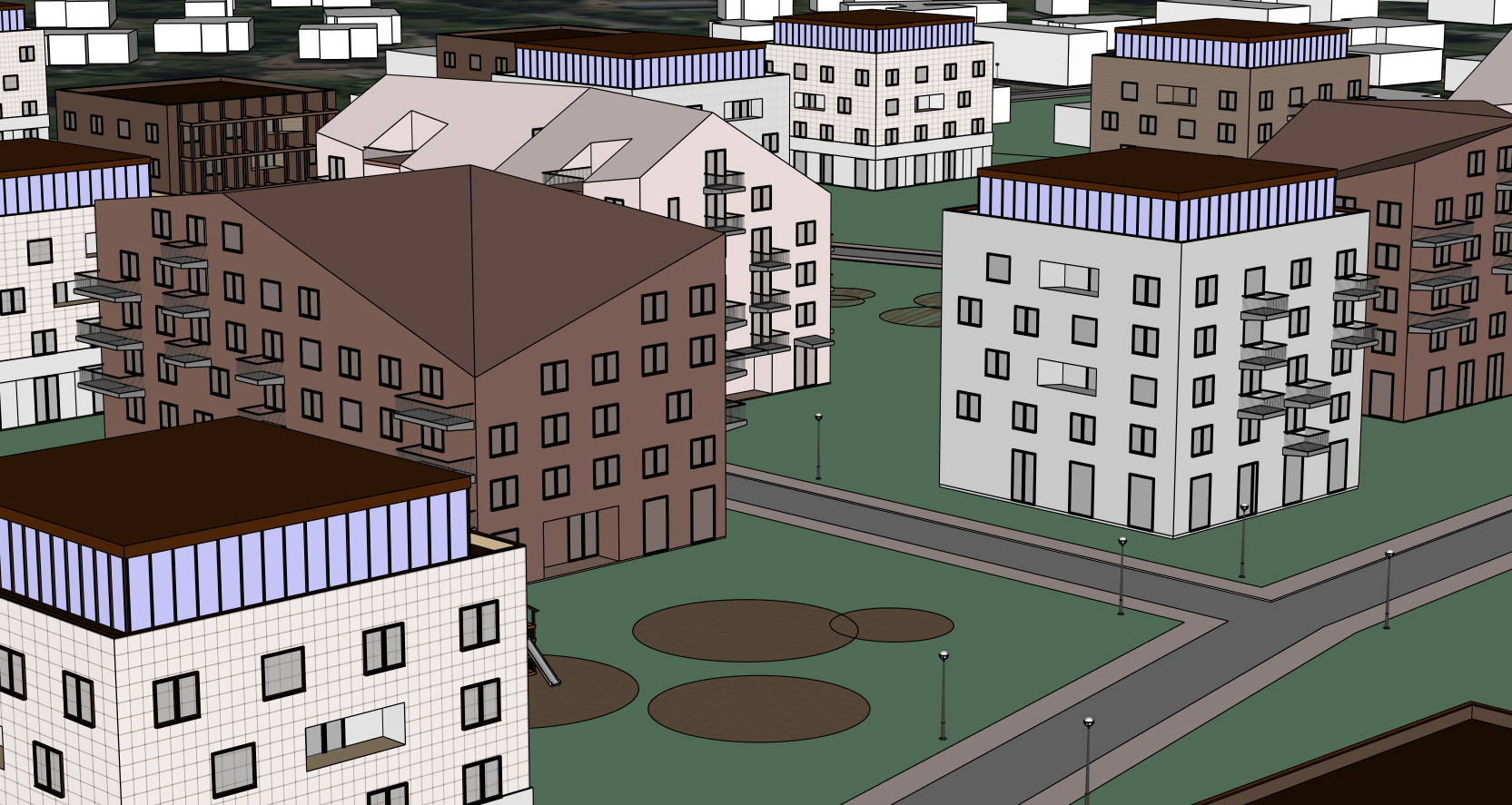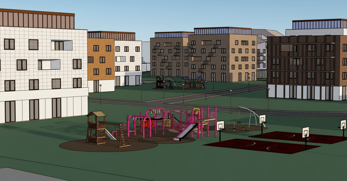 realistic pedestrian path between the buildings with outside terraces and sports areas