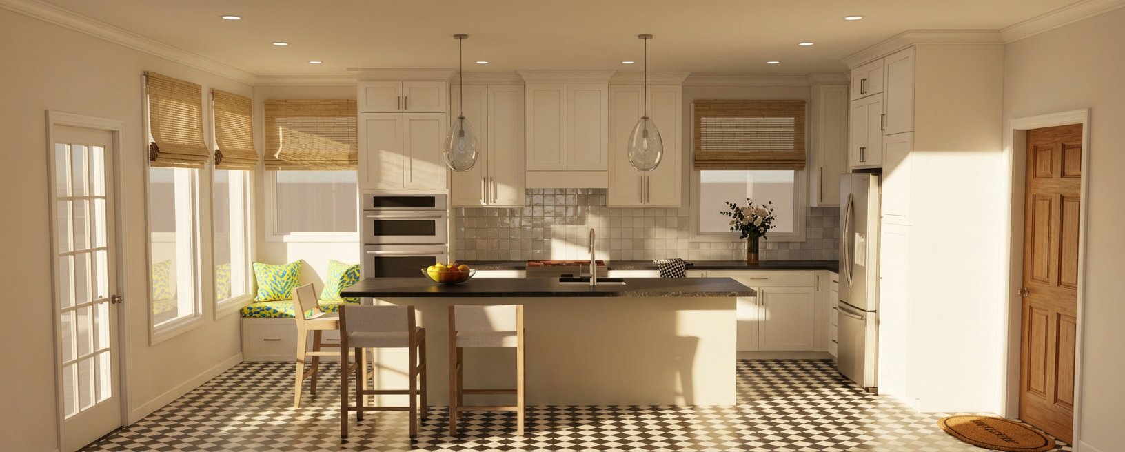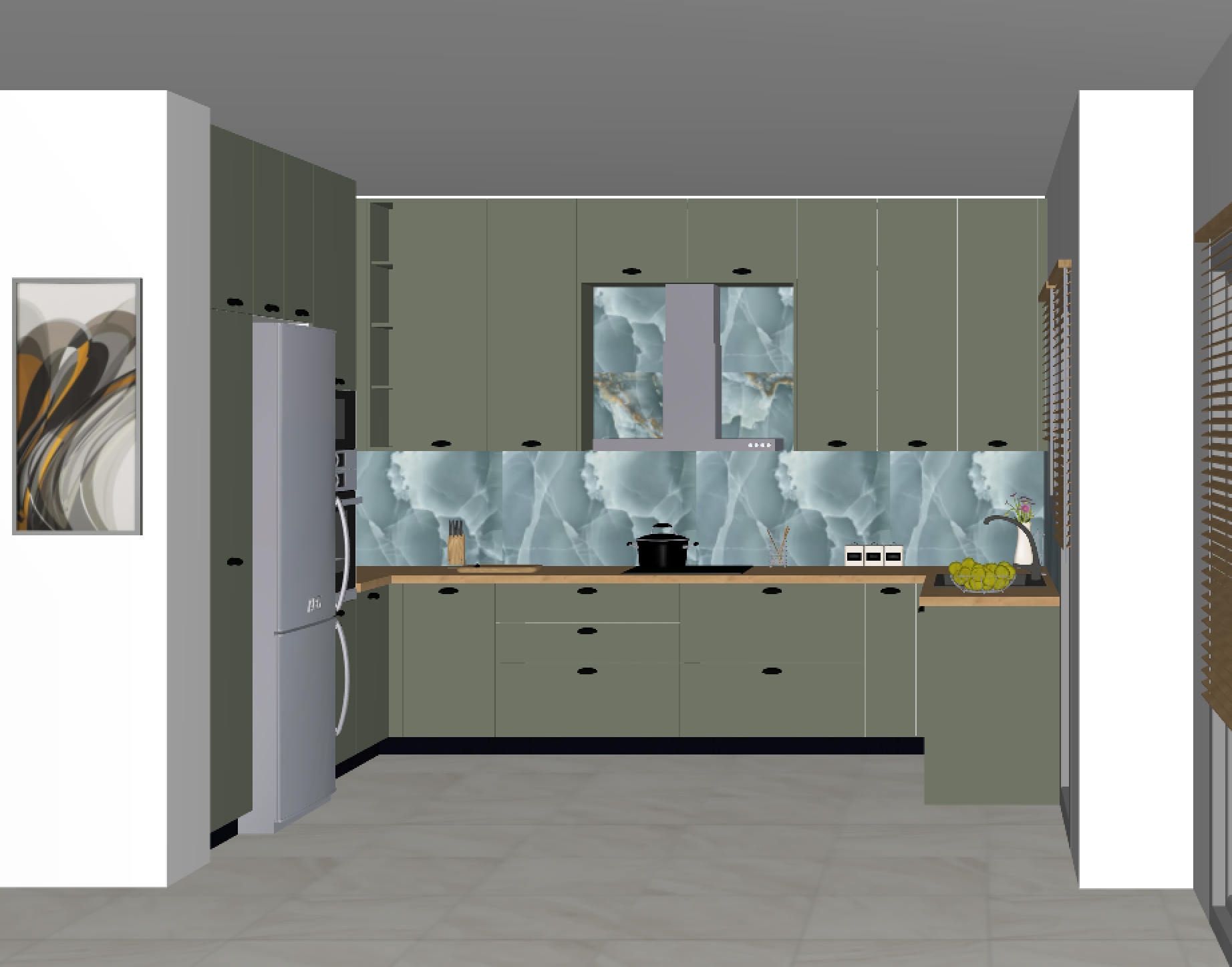 a modern kitchen with a serene atmosphere cabinets are a muted sage green accented by matte black handles the backsplash features a striking blue and white marble texture there s a stainless steel refrigerator on the left the countertop is a light wood topped with a black pot a knife block and a bowl of green grapes a sleek curved faucet is present on the right the floor is a light gray marble soft ambient lighting casts a warm welcoming glow and wooden blinds filter gentle natural light the wall on the left showcases an abstract art piece with earthy tones of brown orange and white