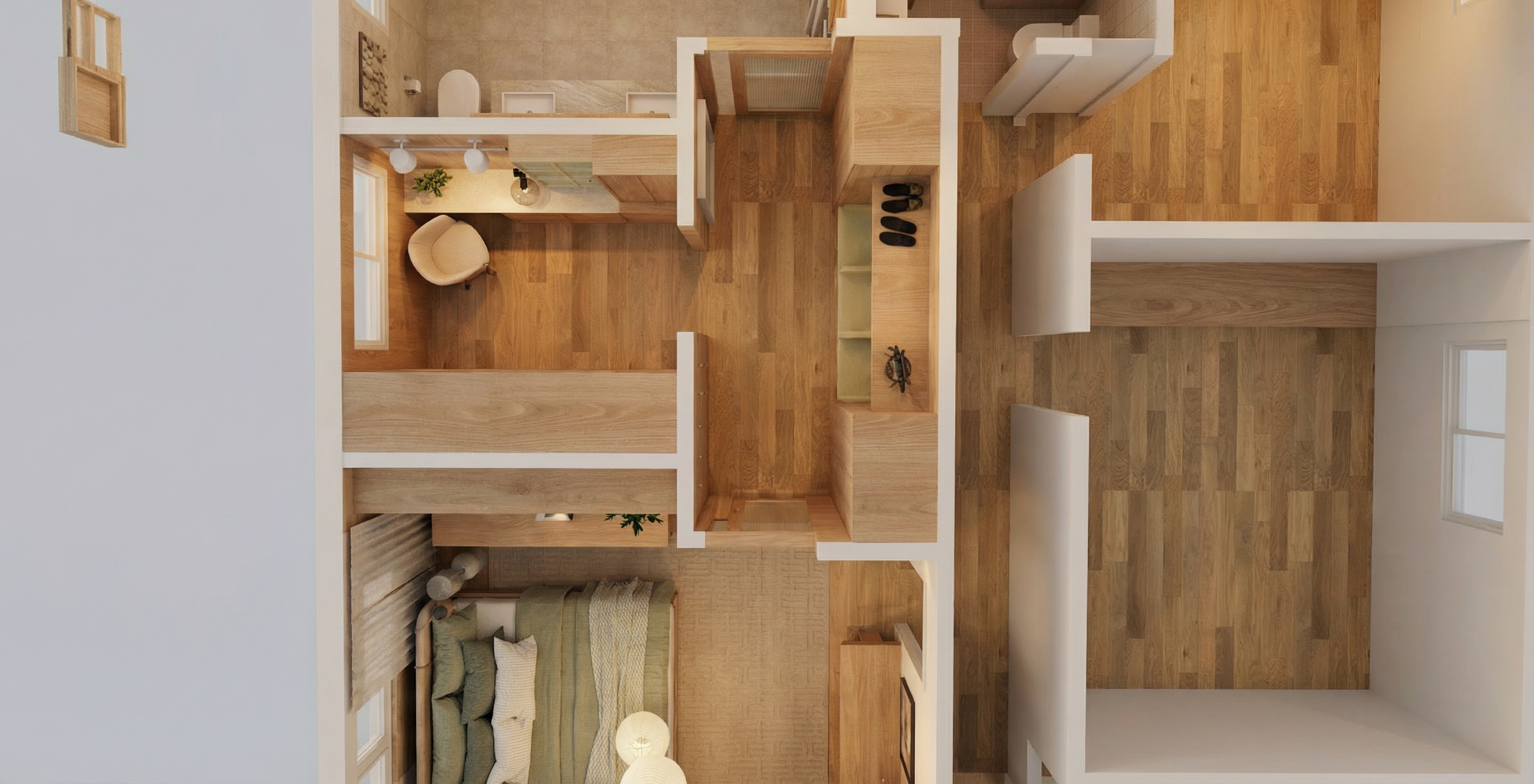 a warm timber interior architectural visualization wide angle wedding space with warm neutral natural wood ceilings vertical timber wall panels oak flooring and daylight filtering through large windows calm and serene atmosphere cinematic interior render soft shadows muted neutral palette scandinavian japandi influence editorial architectural composition calm spatial depth conceptual yet realistic presentation concrete floors white wall in the back