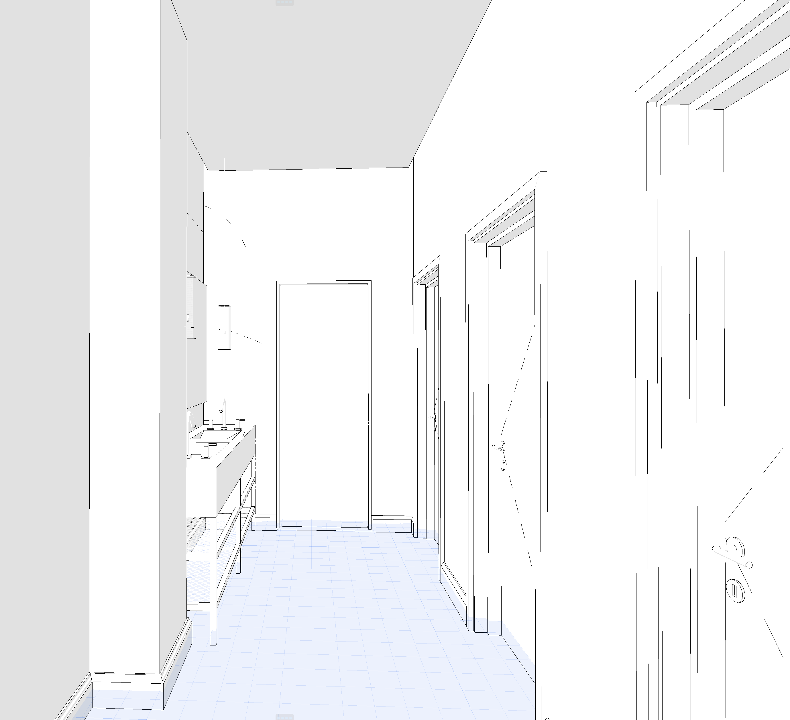 photorealistic render using the provided image as reference industrial minimalist bathroom corridor with exposed concrete walls and ceiling gray brick accent wall on the right and polished concrete floor preserve original architecture proportions and camera angle do not modify layout or volume materials colors raw concrete surfaces with realistic texture dark gray brick wall on right side yellow metallic brass accents on frames pipes railings vanity structure and details matte dark fixtures lighting warm yellow led strip lighting along ceiling perimeter and wall edges backlit mirrors on left wall indirect floor level led strip soft warm neutral light 3000 3500k subtle spotlights in ceiling tracks mirrors full height mirror on left backlit rear opening reflective mirror surface details industrial pipes and exposed installations in yellow metal the frame in the back is a mirror make it reflective minimalist concrete vanity with integrated storage clean modern slightly futuristic industrial mood atmosphere quality high realism global illumination ray traced reflections cinematic lighting fast render optimized ultra detailed textures camera keep original framing and perspective no distortion or cropping