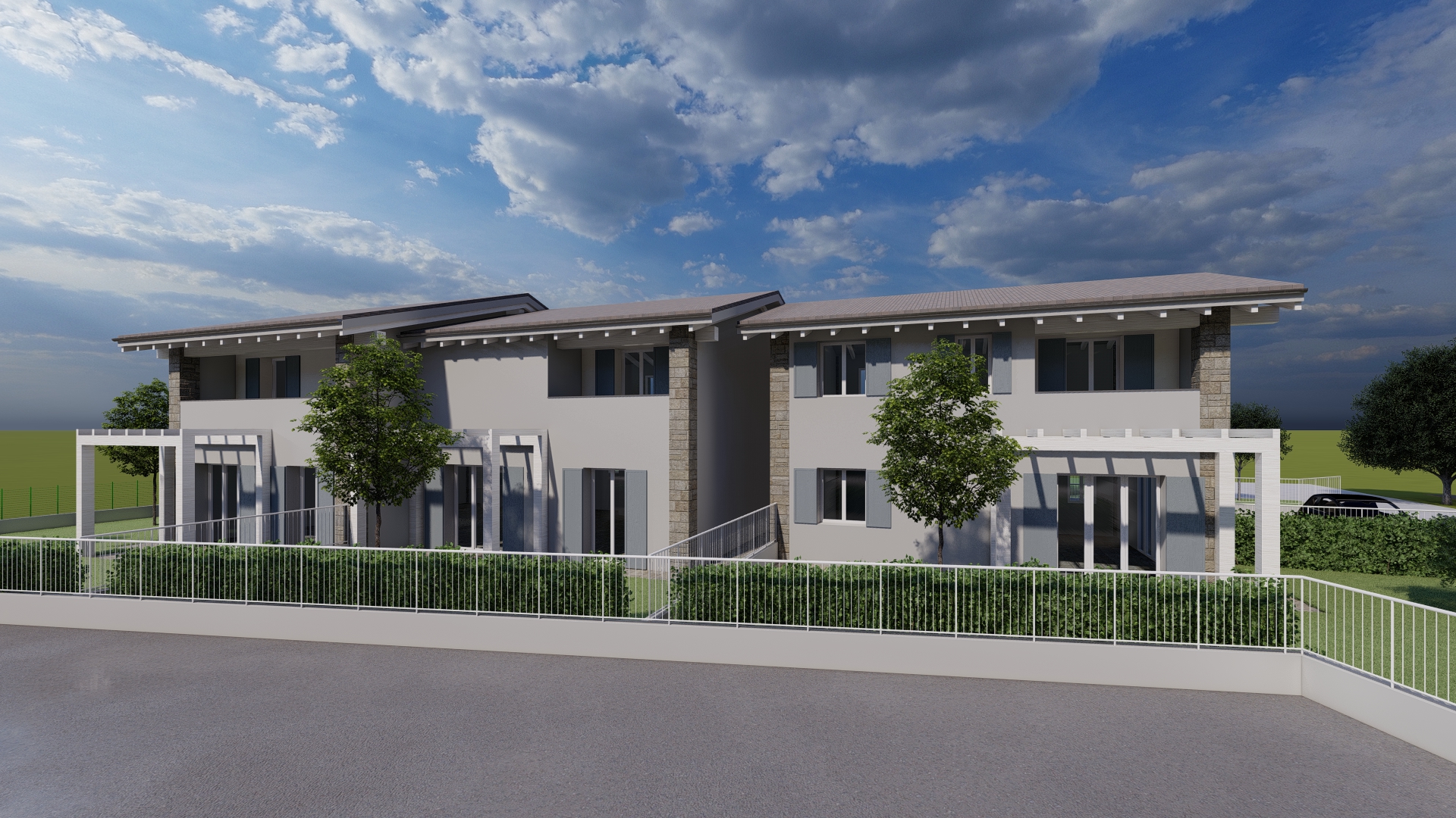 modern duplex building in a serene environment featuring a light beige facade with stone accents in a natural gray color the roof is a subtle taupe complementing the white framed windows lush vibrant green shrubs and trees adorn the landscape adding a touch of nature the sky is a brilliant blue with soft fluffy white clouds creating a peaceful atmosphere the pavement is a soft muted gray accentuating the calm and inviting ambiance