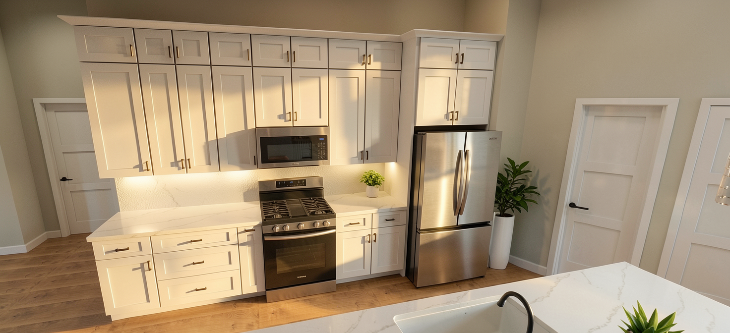 please render this in white siding black roof and black garages with driveways with luxury cars