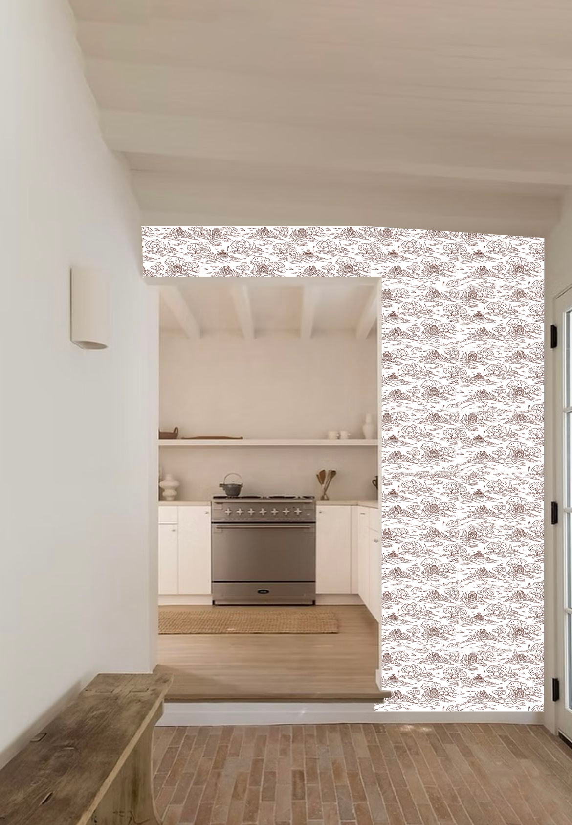 apply exactle this wallpaper also to left wall add white doorframe