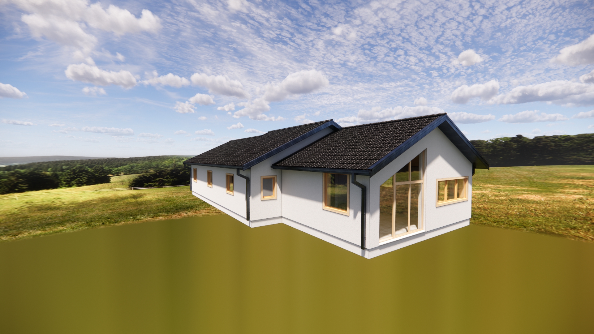 modern house with a white exterior and large windows set in a vibrant countryside the roof is dark gray slate the background features expansive green fields with soft rolling hills under a clear blue sky dotted with fluffy white clouds the atmosphere is serene and idyllic evoking a sense of tranquility and openness