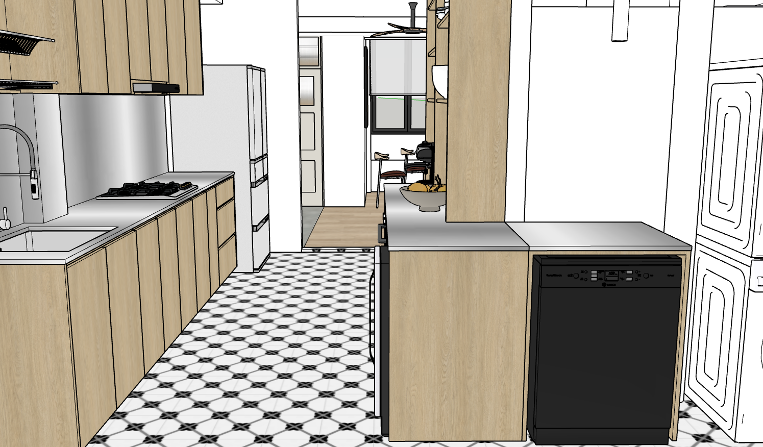 stainless steel counter top stainless steel backsplash led strip lighting white oak wood panels black and white tile flooring white painted walls