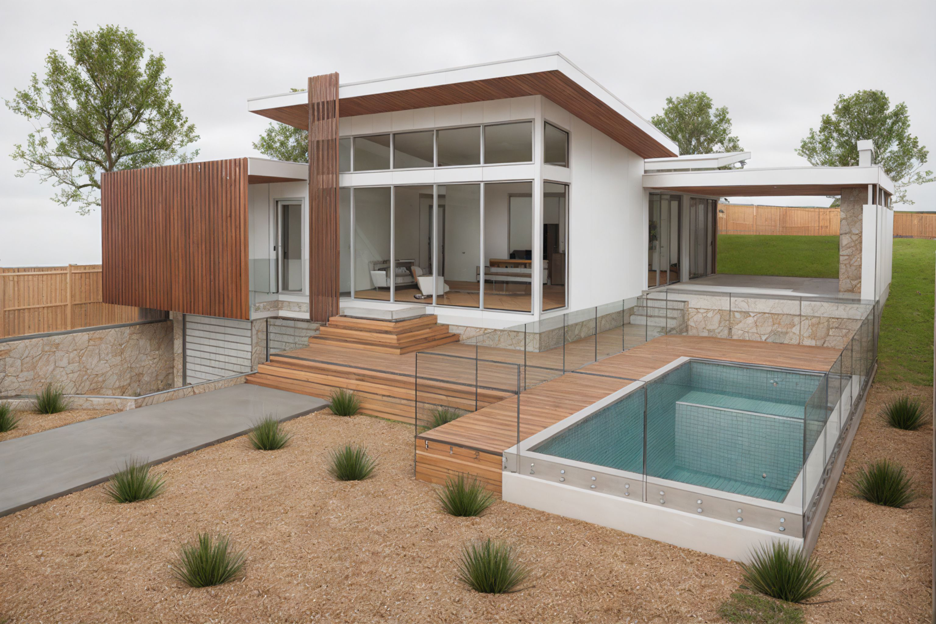 modern beach side house in australia exposed aggregate path sand and dirt garden beds with small native australia grass shrubs warm timber decking around pool and vertical timber cladding to facade with contrast white rendered cladding timber ceiling lining large trees and residential land in background with blue sky and morning sunlight front the front right