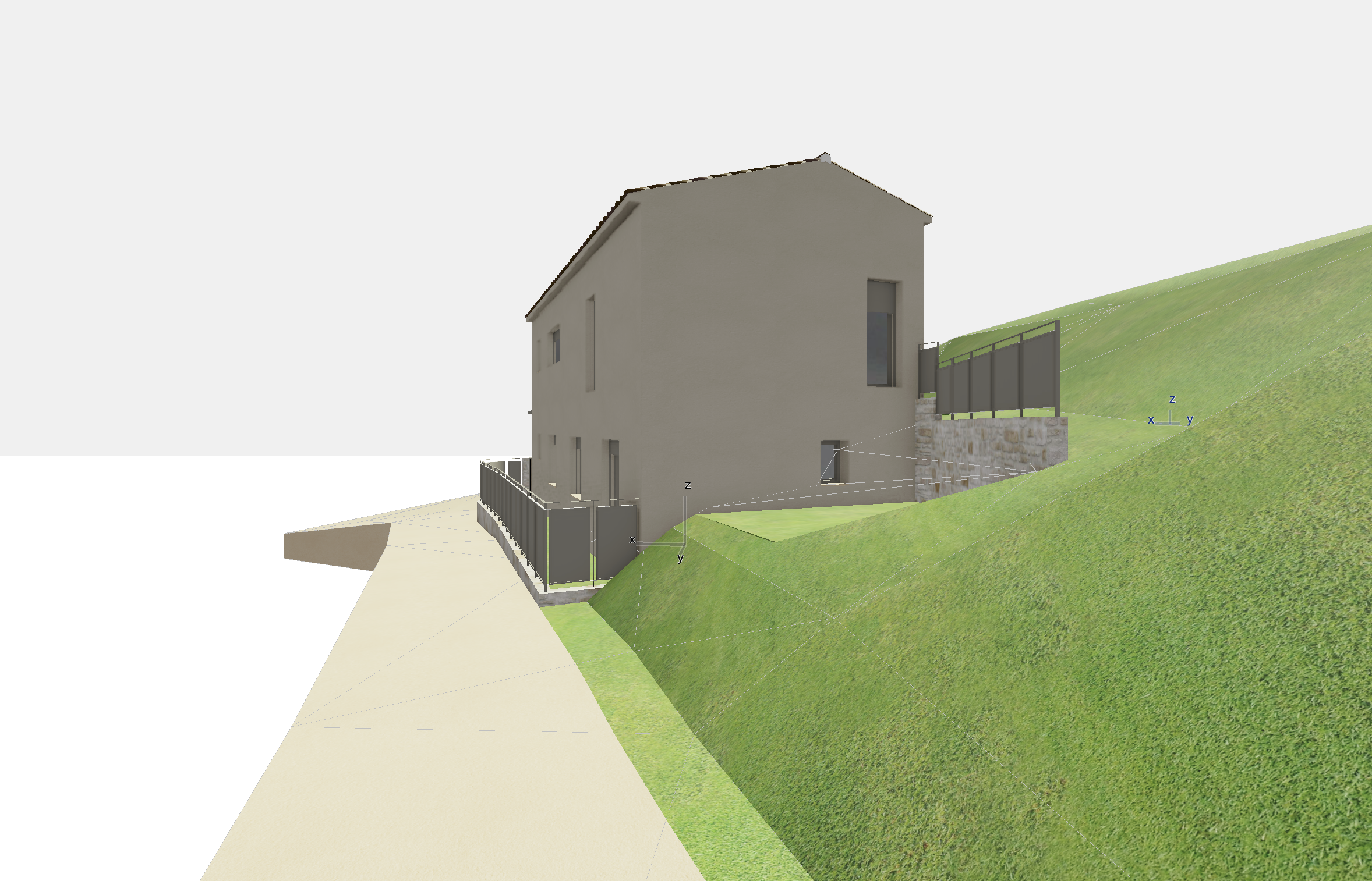 there are some mediterranean pine trees in the right background tree shadows on the facade fences and windows are ral 7030 there is a cypress tree on the right at the left of the image there is houses and mediterranean pine trees some lavender on the right