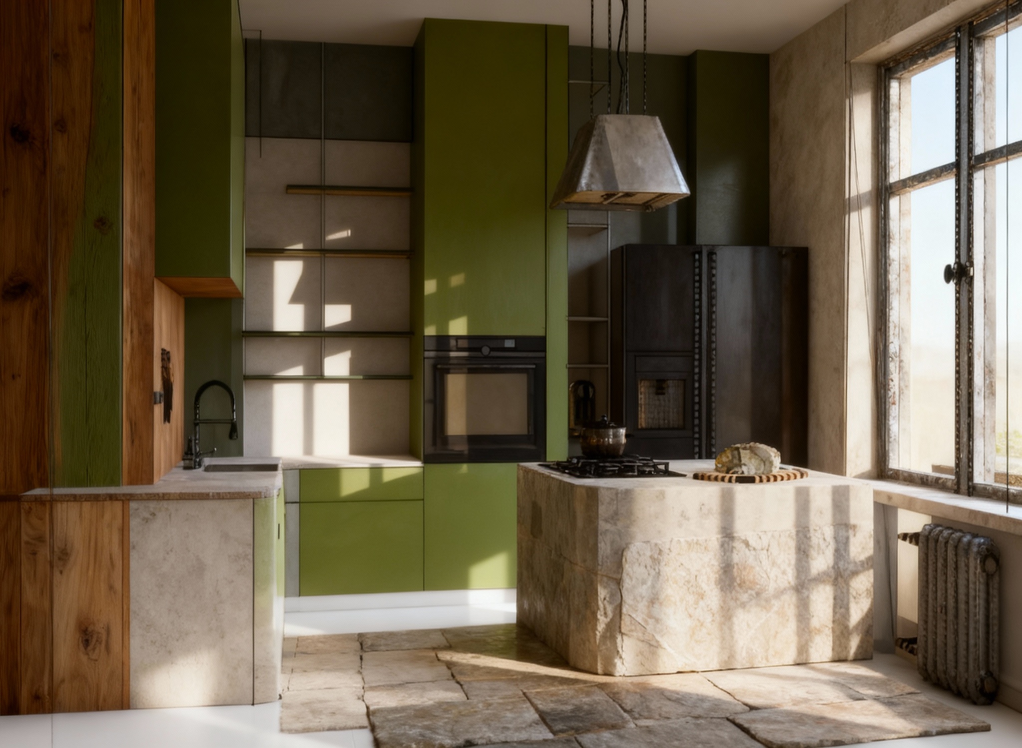 zielone szafki drewno i bia a pod oga z du ych p yt zielony bardziej butelkowy bia y okap a ni to du o wiat a meble w kolorze taupe foto nocne poprosz ciep e wiat o z za okna