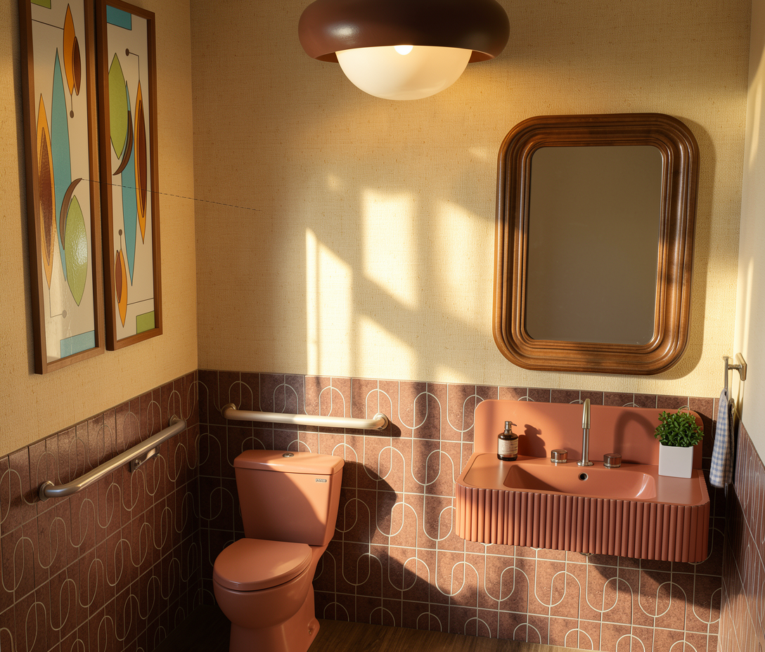 make the shower tile off white ceramic and calacatta vagli marble flooring and countertop and white oak vanity without hardware and make the fixtures aged unlacquered brass