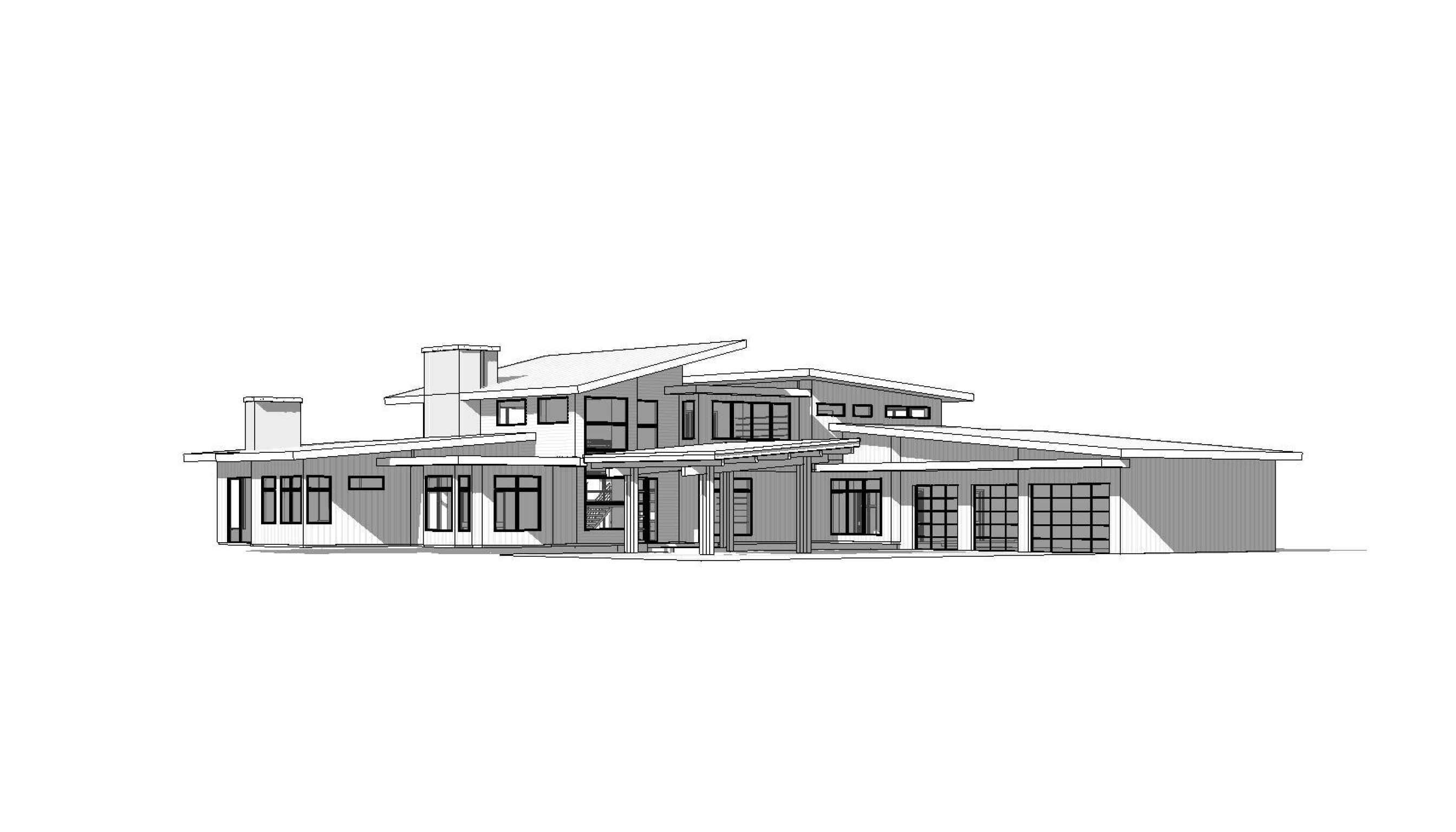 backyard view of a clean mountain modern home architectural exterior rendered in cinematic day time lighting warm vertical wood siding with similar simple minimal grain pattern black roof visible prominent snowy colorado mountain range landscape in the background natural wood textures high fidelity photorealistic visualization crisp shadow falloff refined fa ade geometry richly detailed grain patterns soft atmospheric depth calm minimal landscaping premium architectural photography mood ultra clean composition and materials beautiful manicured gardens with hedges lining the property