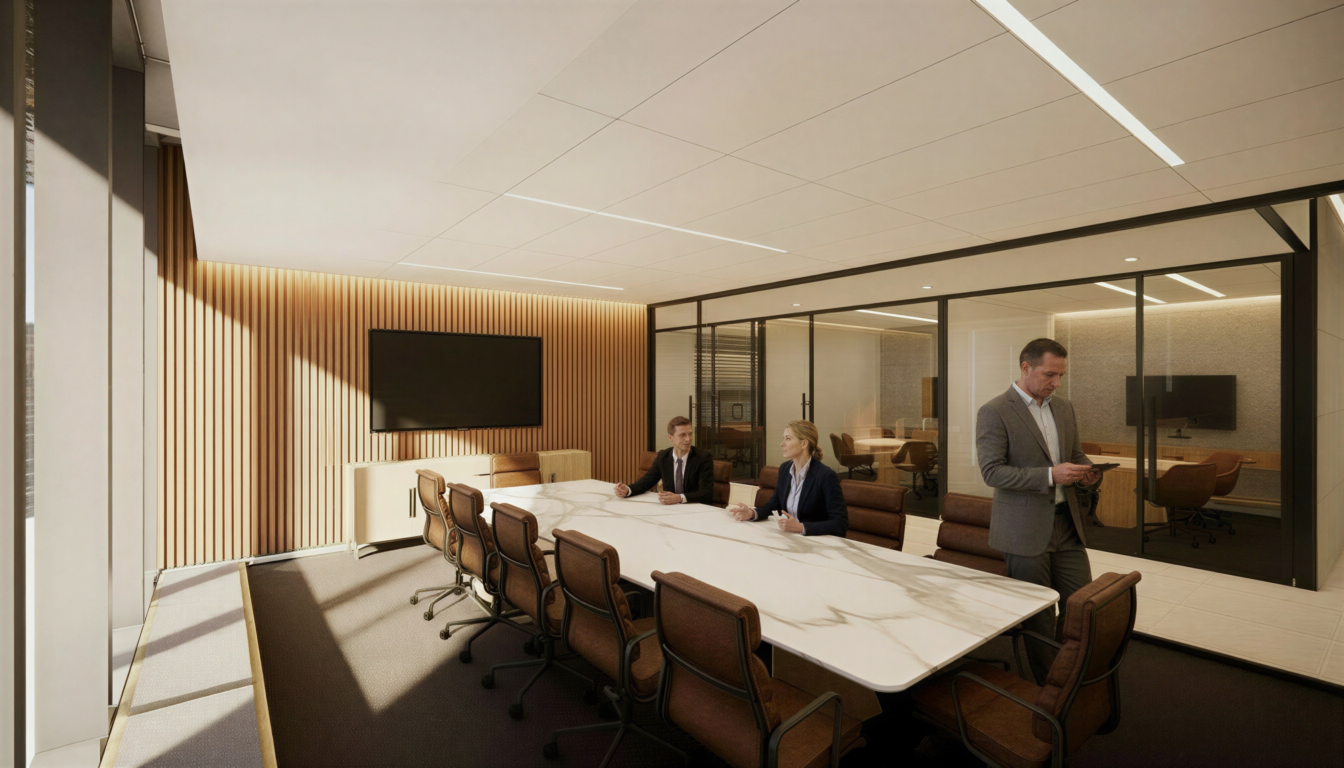 transform the provided interior image into a high end photorealistic render with warm atmosphere soft glowing highlights and relaxed upscale energy while keeping everything exactly the same same proportions and same spatial configuration do not move or alter any objects geometry or furniture positions all objects throughout must remain exactly in the same locations and proportions but their materials should read realistically provide different finishes to furniture and carpet provide white slat ceiling texture lighting should come from above feature interior lighting with gentle reflections soft shadows and luxurious catalog level realism do not change angle of the rendering keep as is illuminate the rendering with daylight coming from left windows
