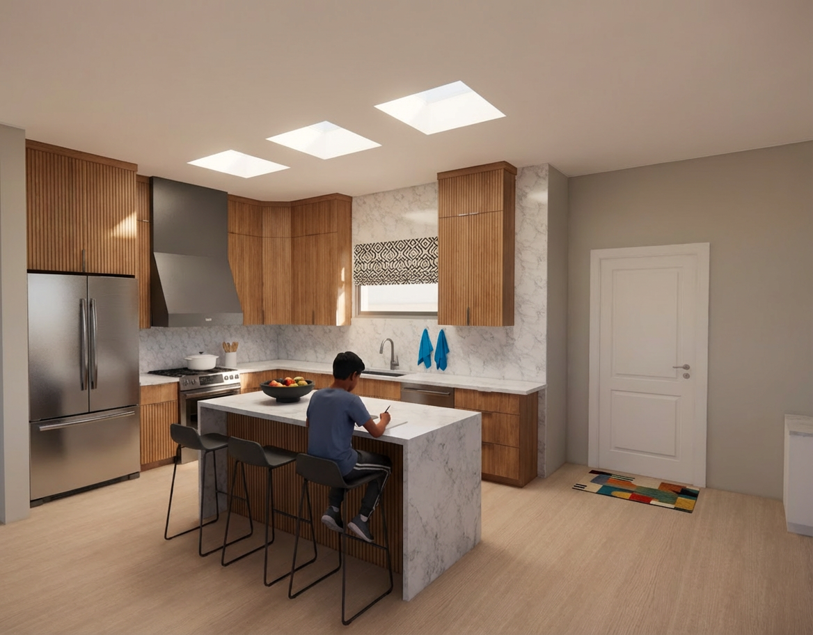 minimalism exterior shot kitchen with oak floor architecture