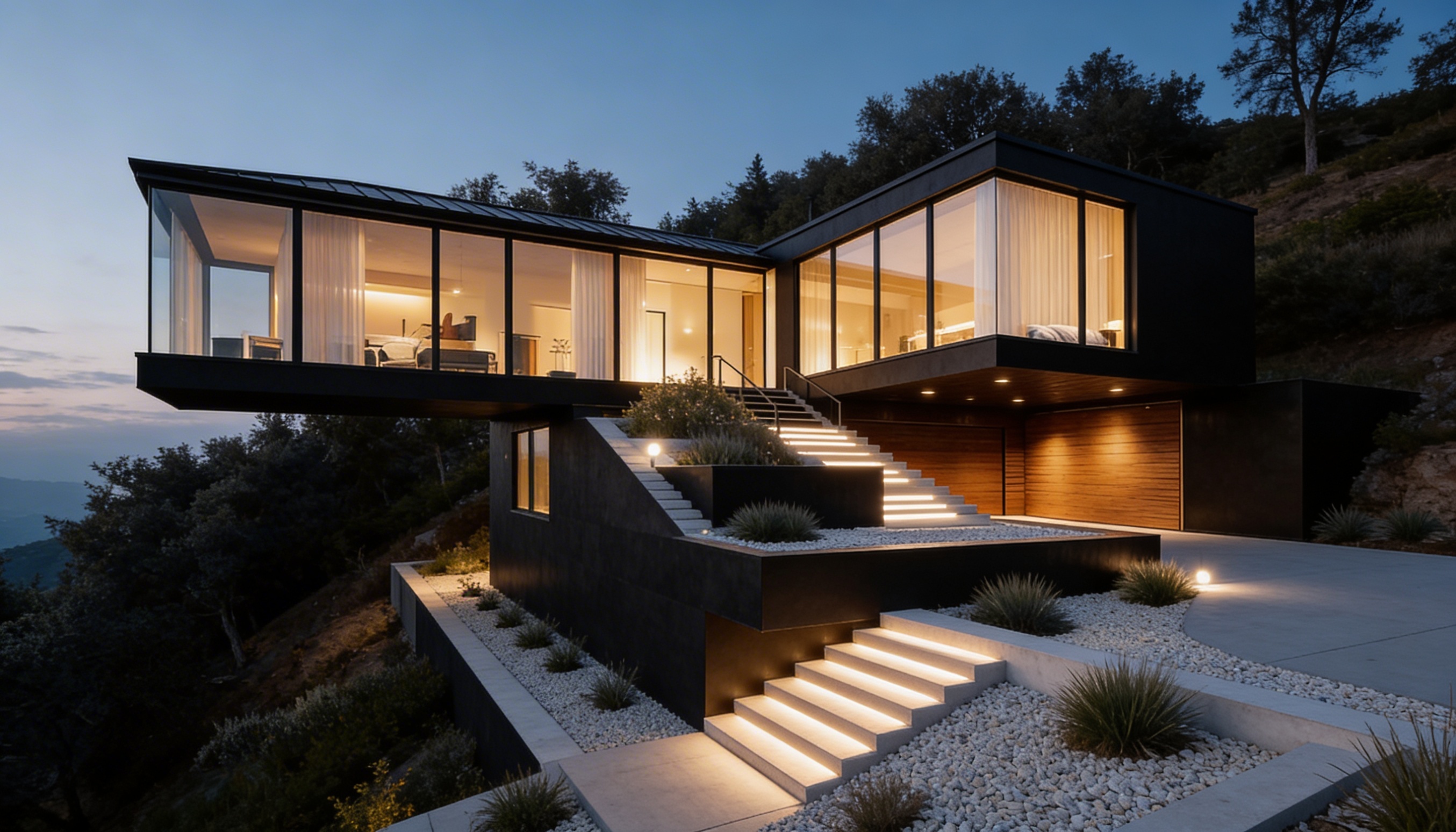 sketchup drawing to render a wooden bridge for a small dog with small wooden stacks in front of a standaard belgian house the picture is of the right facade and the platform on the upper right on the first floor is the terrace with a metal fencing with a cross shape there are only 2 windows in the drawing