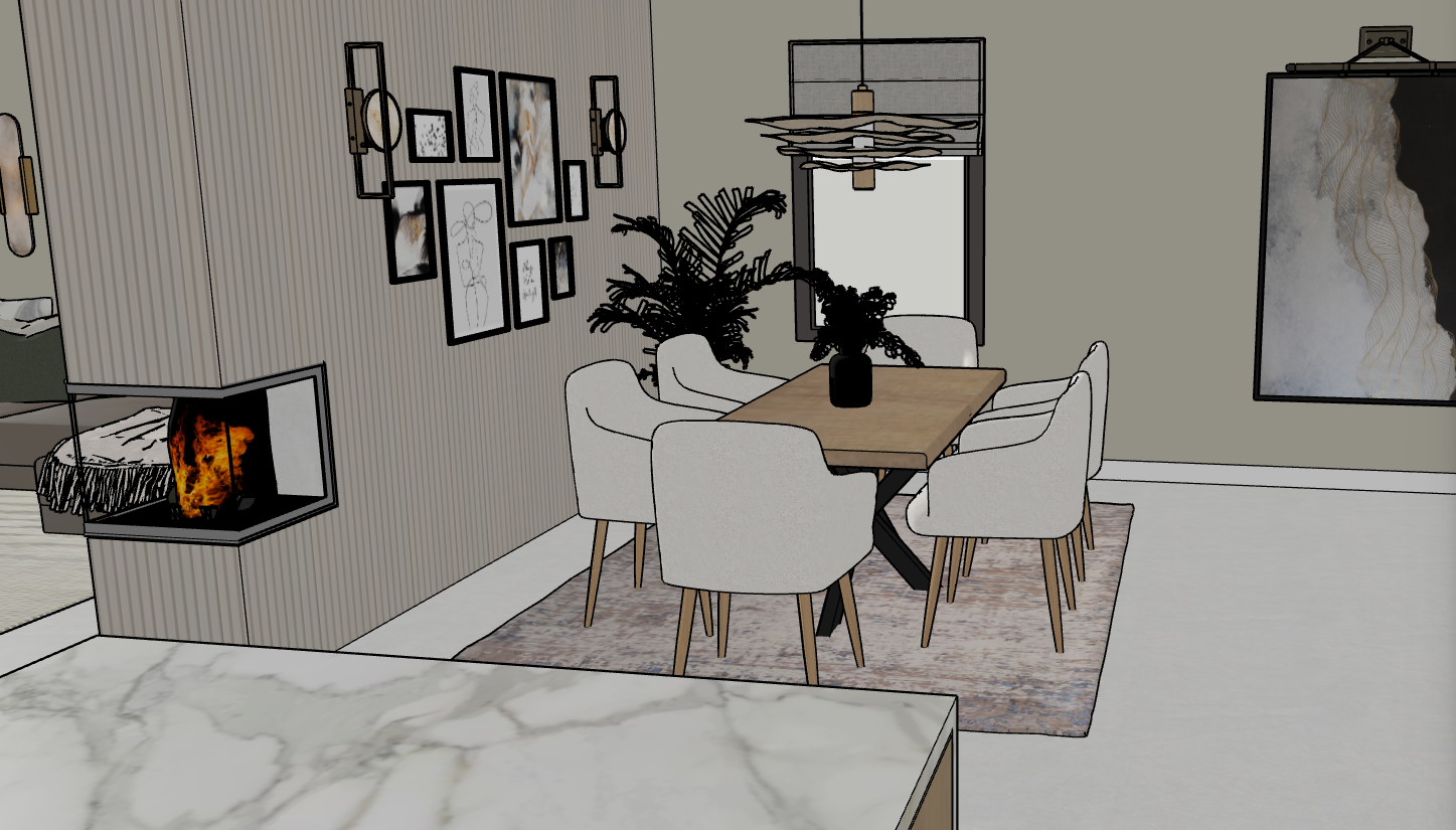 fire on with wall lights on and pendant over dining table evening light