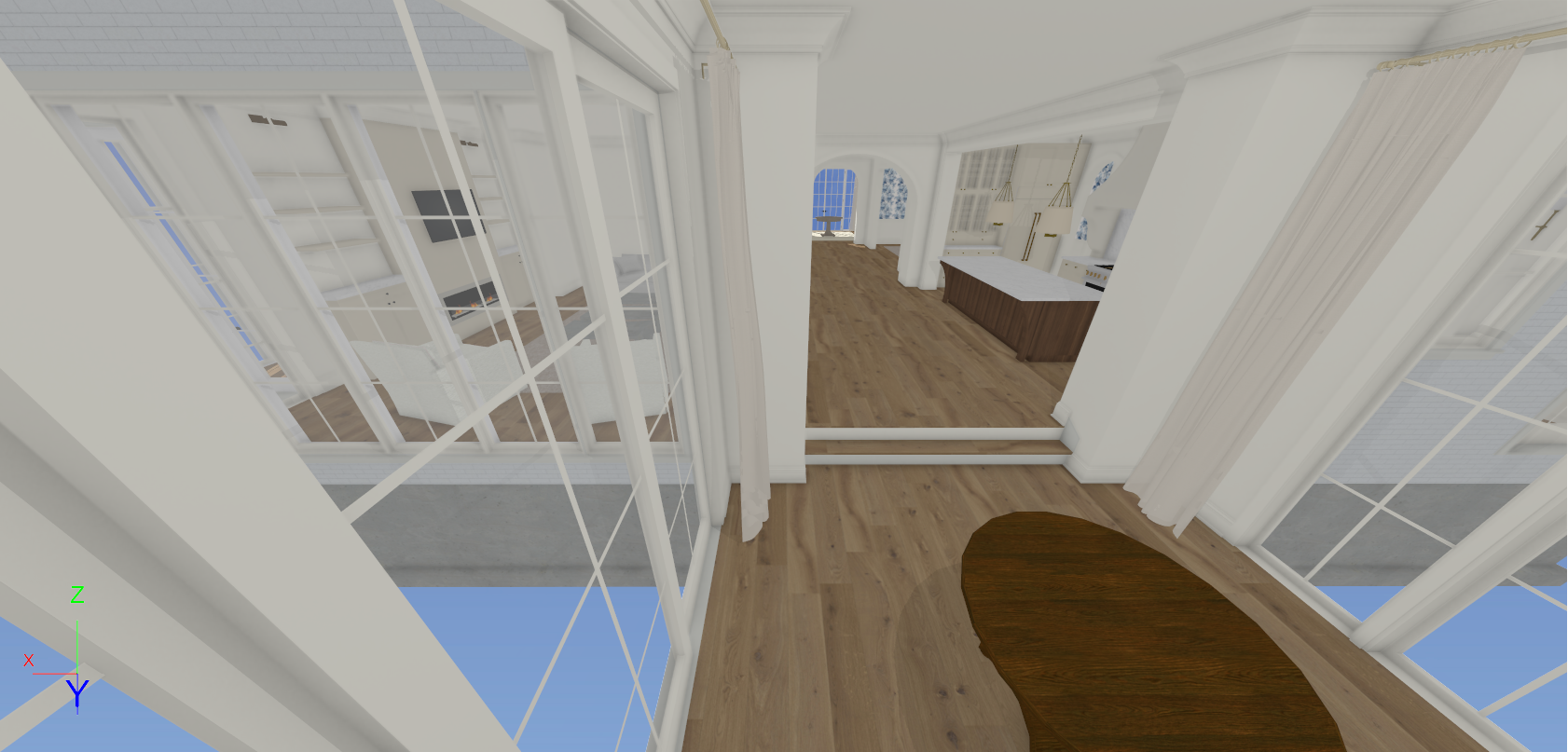 add drapes with brushed brass railing kitchen island is dark walnut add kitchen pendants that are visual comfort charleston lantern cabinets are benjamin moore oc 14 natural cream add landscaping hydrangeas outside change dining room wall paper to branches with birds add decor
