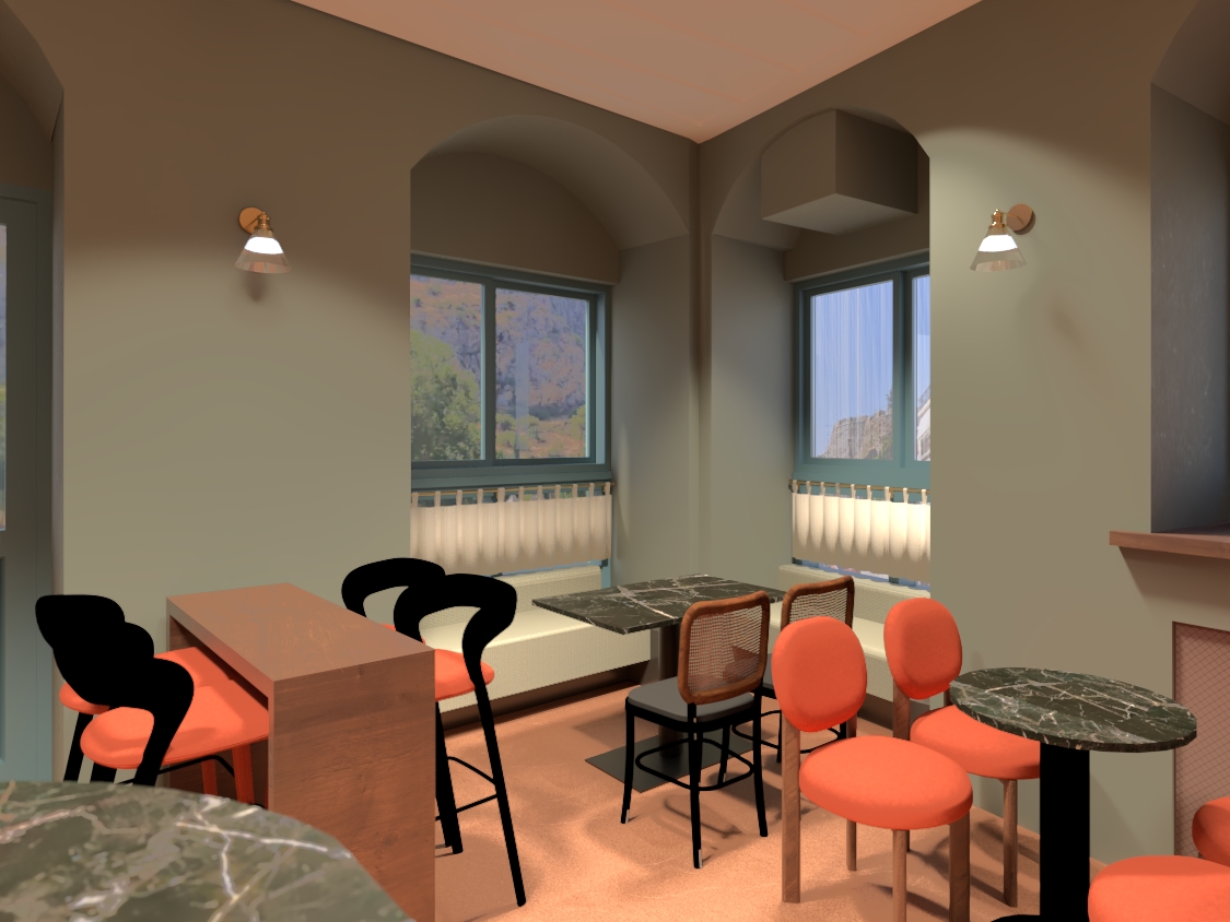 transform the provided coffe bar interior image into a high end photorealistic render with warm golden hour atmosphere soft glowing highlights and relaxed upscale coastal energy while keeping everything exactly the same same proportions same bar shape same booth seating same ceiling curves same wall finishes same curtains same materials and same spatial configuration do not move or alter any objects geometry textures colors or furniture positions the chairs throughout the restaurant must remain exactly in the same locations and proportions but their materials should read realistically chairs should appear upholstered in soft reddish teracotta fabric with subtle natural tone but upholstere with a matte plush surface and gentle directional nap while keeping their shapes frames and positions unchanged add premium table settings including coffee glass and a cake on plate while keeping all tables and chairs in their exact positions include modern young guests sitting at the the bench infront of the windows exactly in the position that exsist on the model and at selected tables casually social correctly scaled tastefully integrated without crowding or obstructing architectural details alignment lighting should emphasize golden hour warmth gentle reflections soft shadows enhanced color richness and luxurious catalog level realism improve depth and realism through wood grain richness marble shine brass highlights fabric texture and polished clarity while keeping the entire scene exactly as originally designed