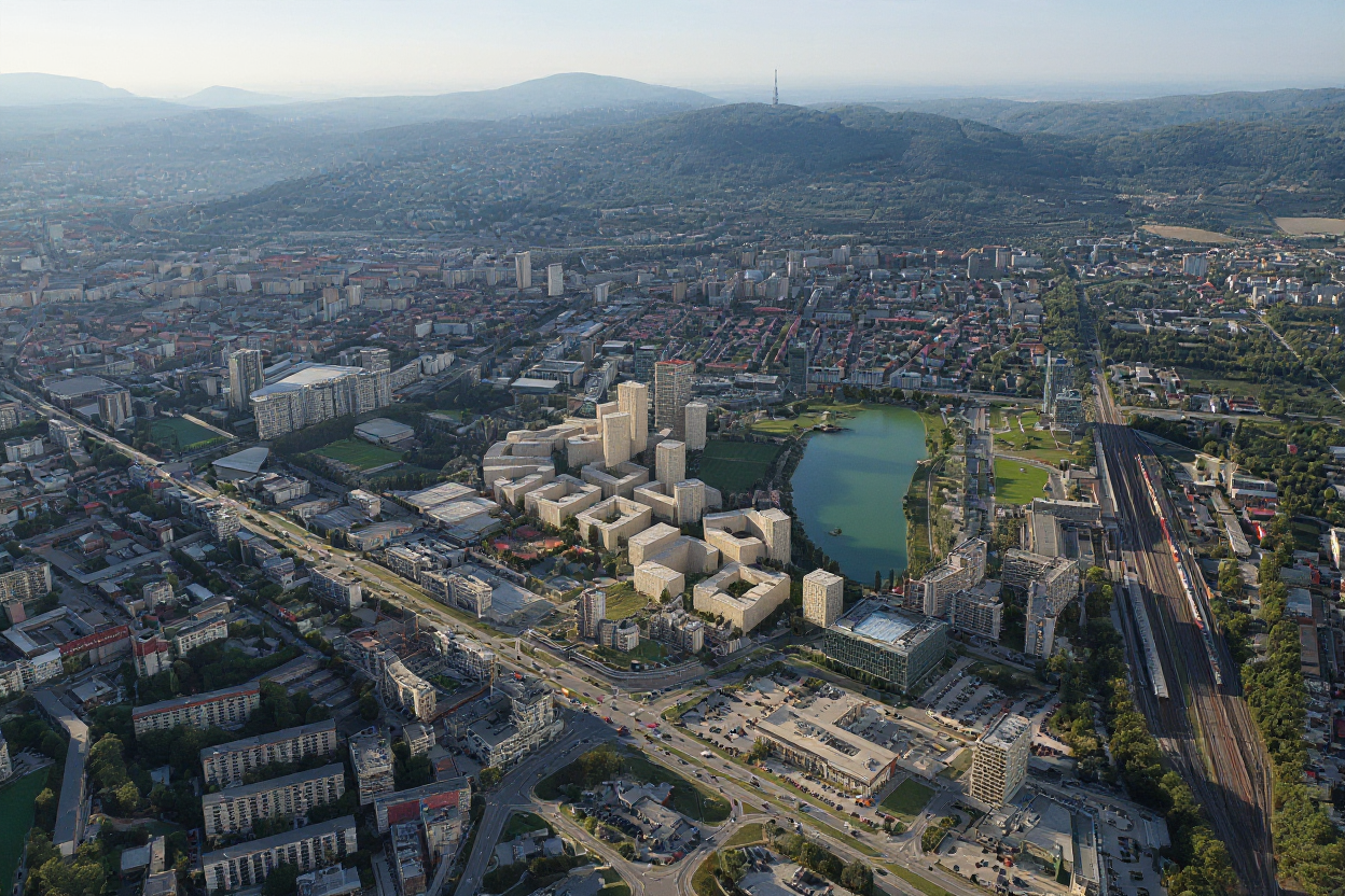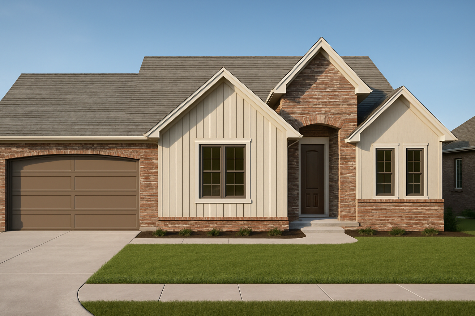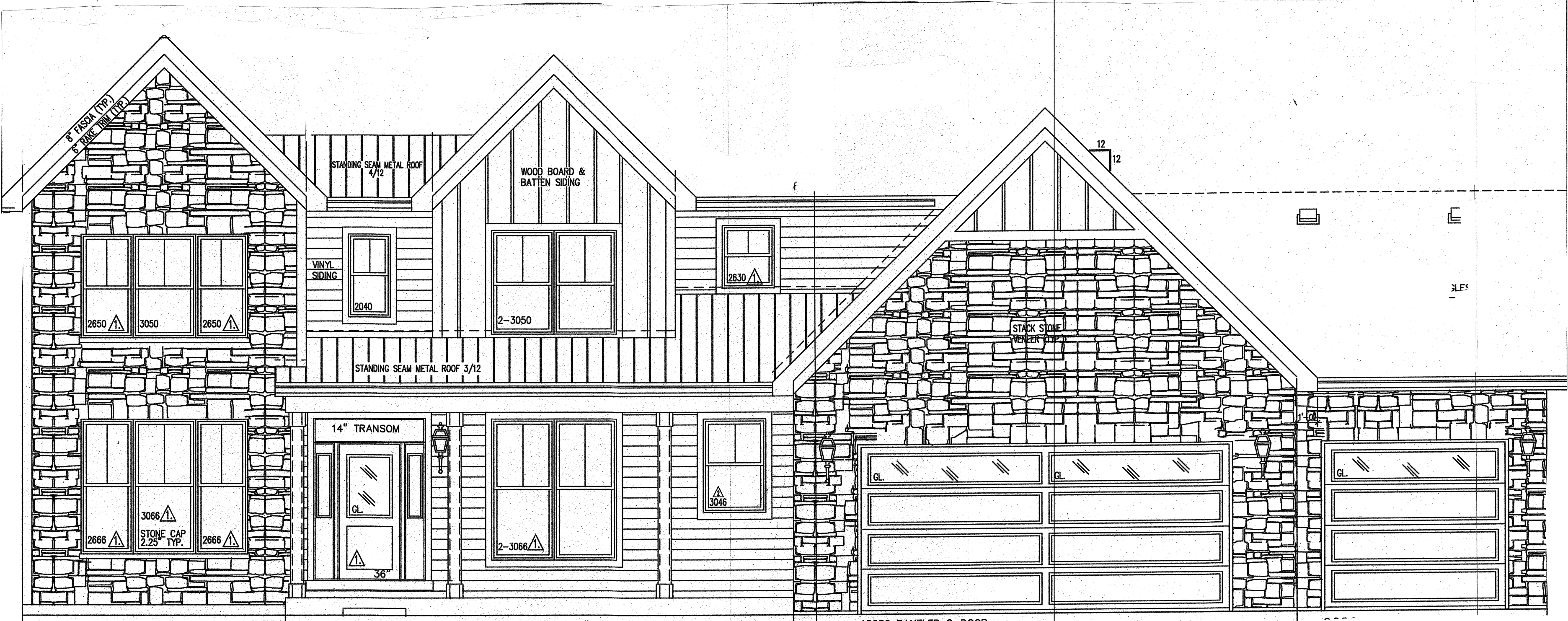 white stone and dark gray garage doors and matching windows and a black shingle roof