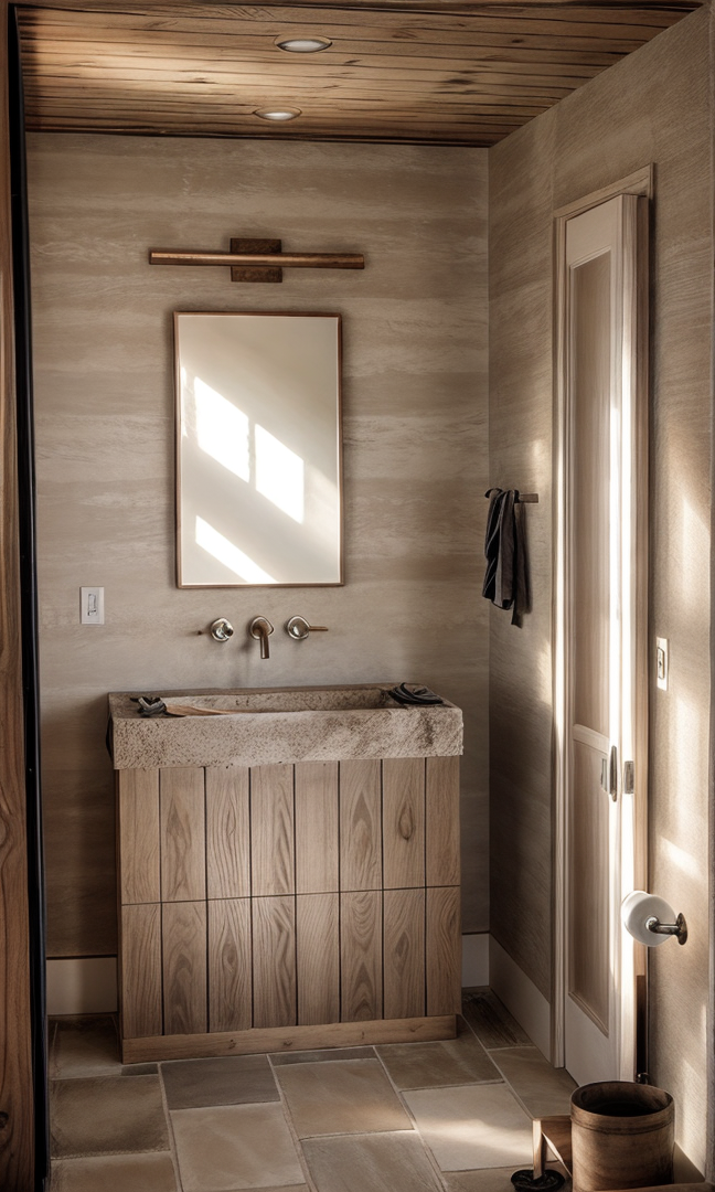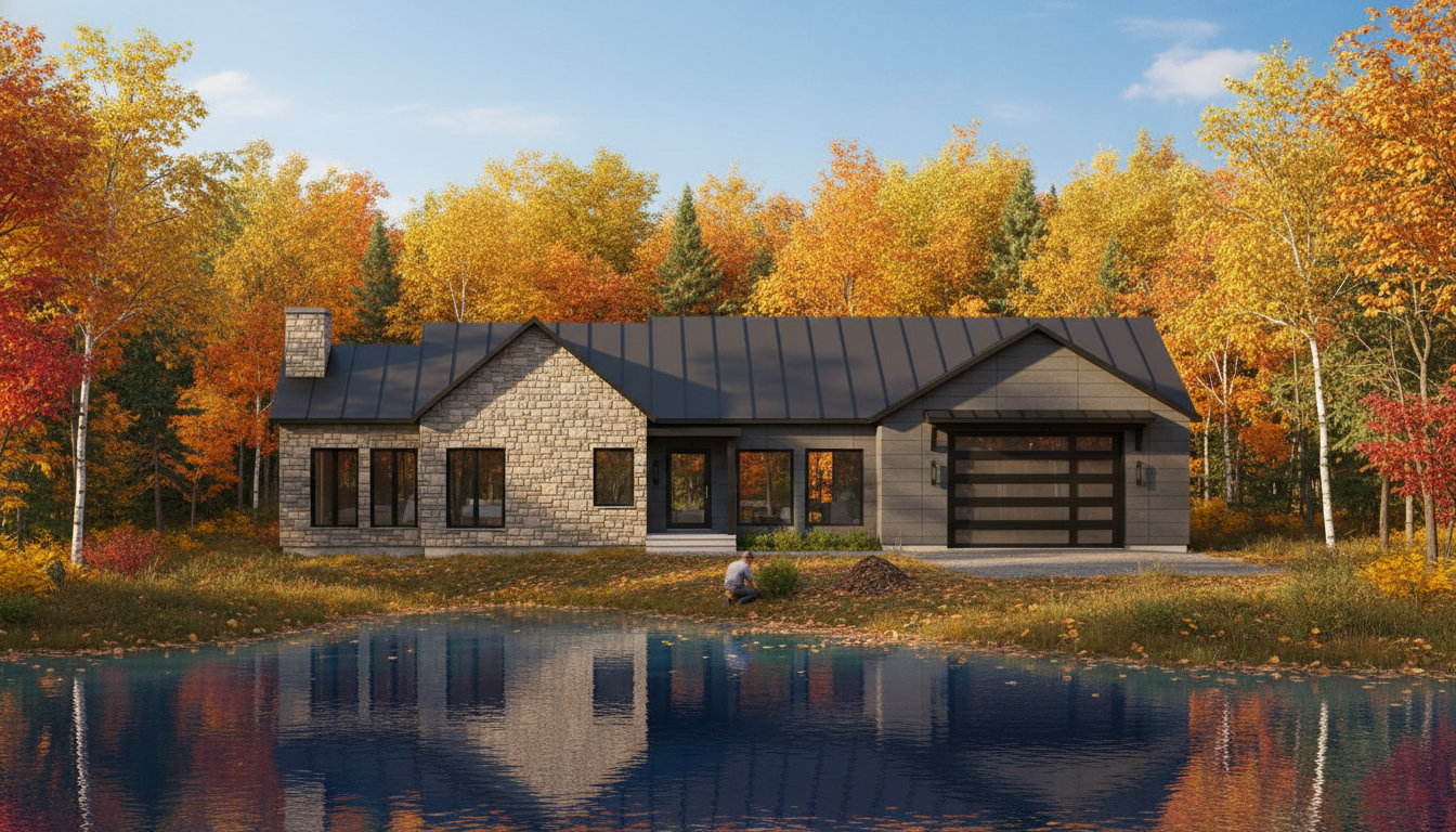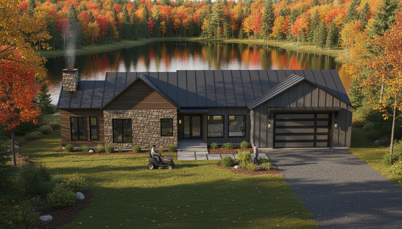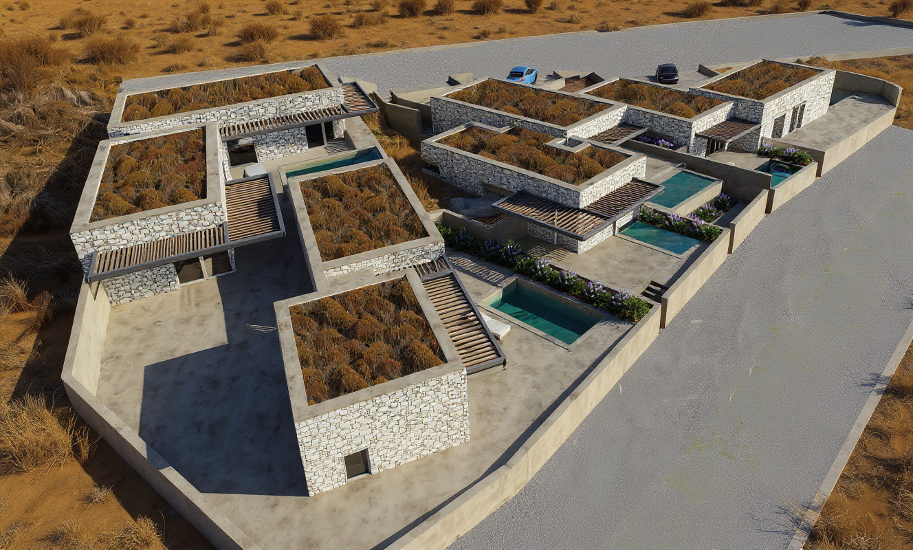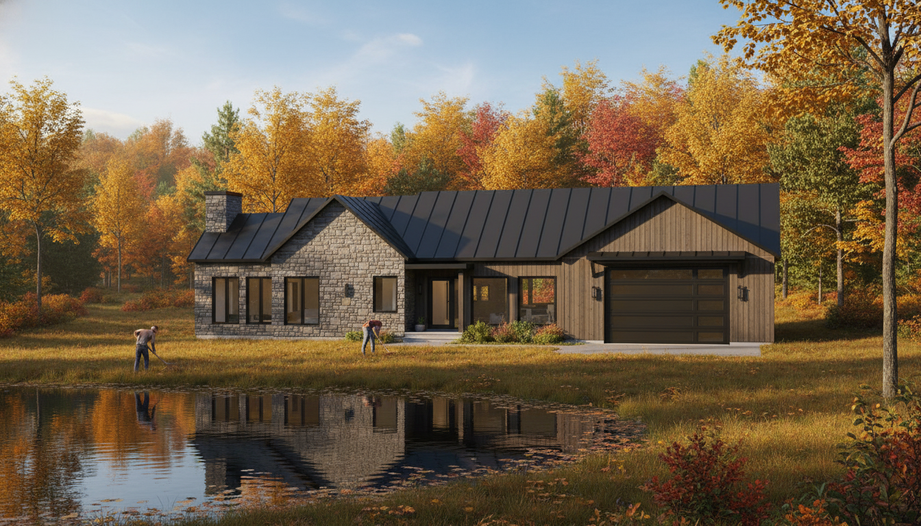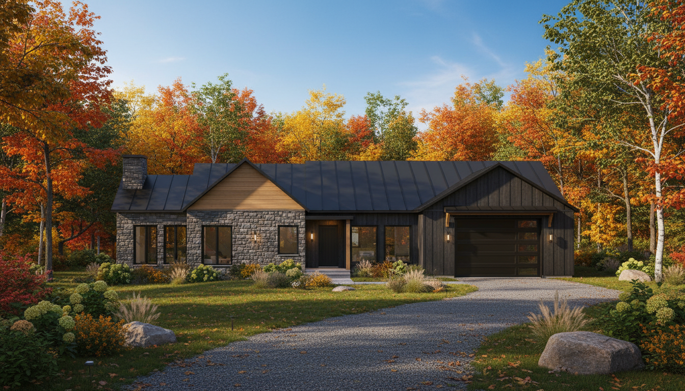 please create a polished version of this 3d cad rendering remove the pendants over the kitchen island add a mid century modern chandelier over the dining table add mid century modern chairs to the dining table in the same wood tonality