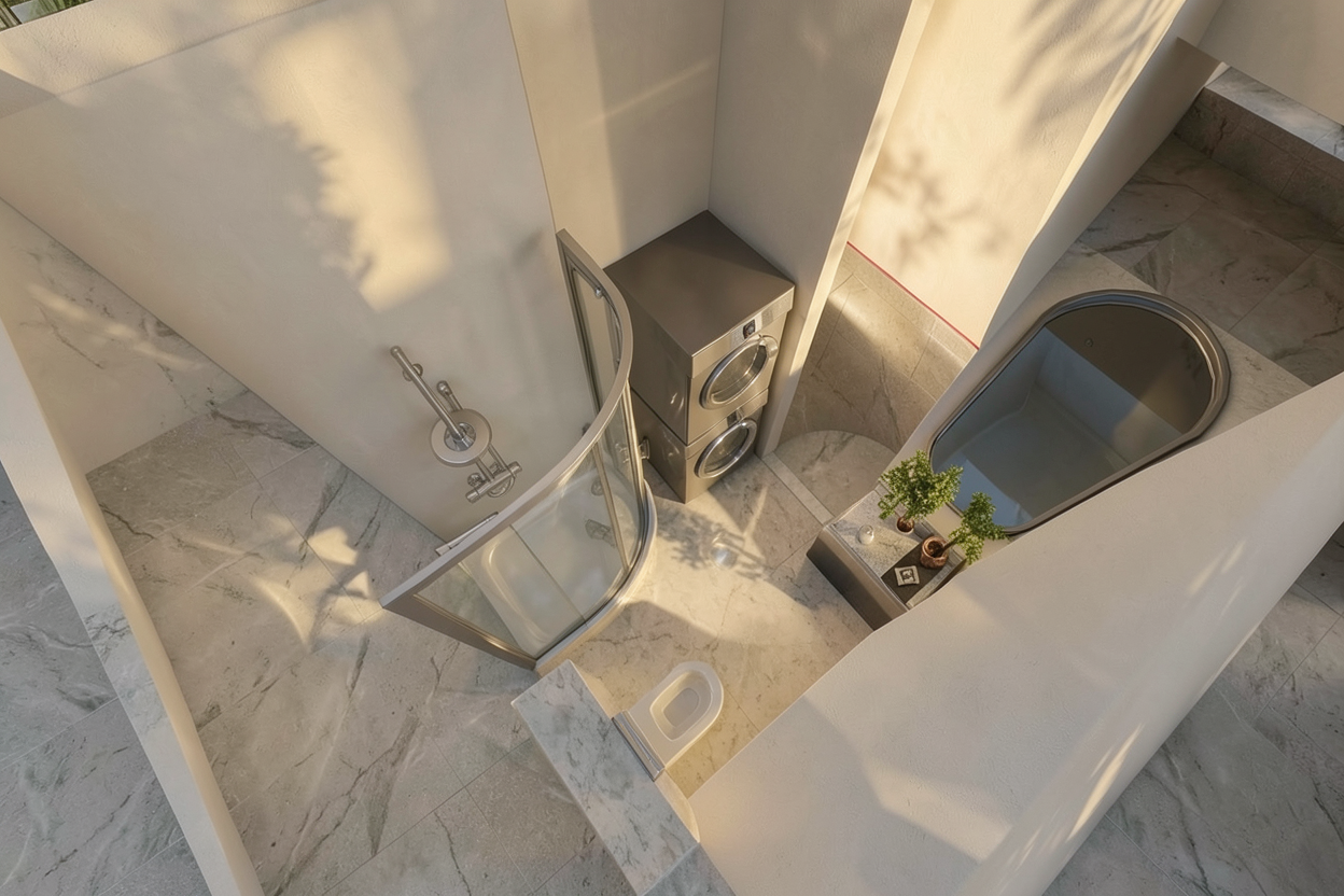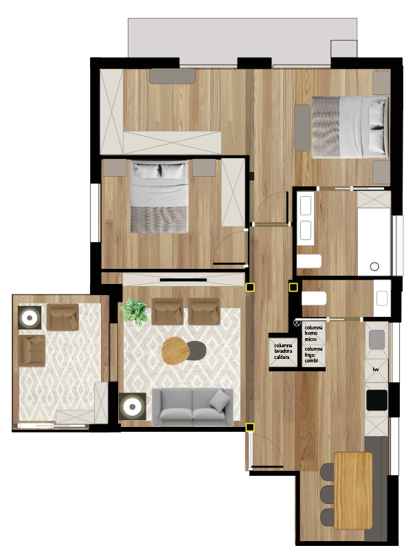 convert this floor plan into a realistic isometric 3d view of a full house show the space from an elevated angle with furniture walls and details visible use the same furniture as shows on the plan do not change the orientation of the floorplan
