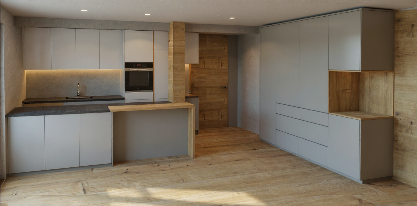morning vibes in the kitchen spotlights in the over the counter for more brightness countertop in black stone the grey cabinets are white matt uch much more daylight from the window reihgt door in the background is a door in oak like the table rightwindowdoor in an oak slidedoor