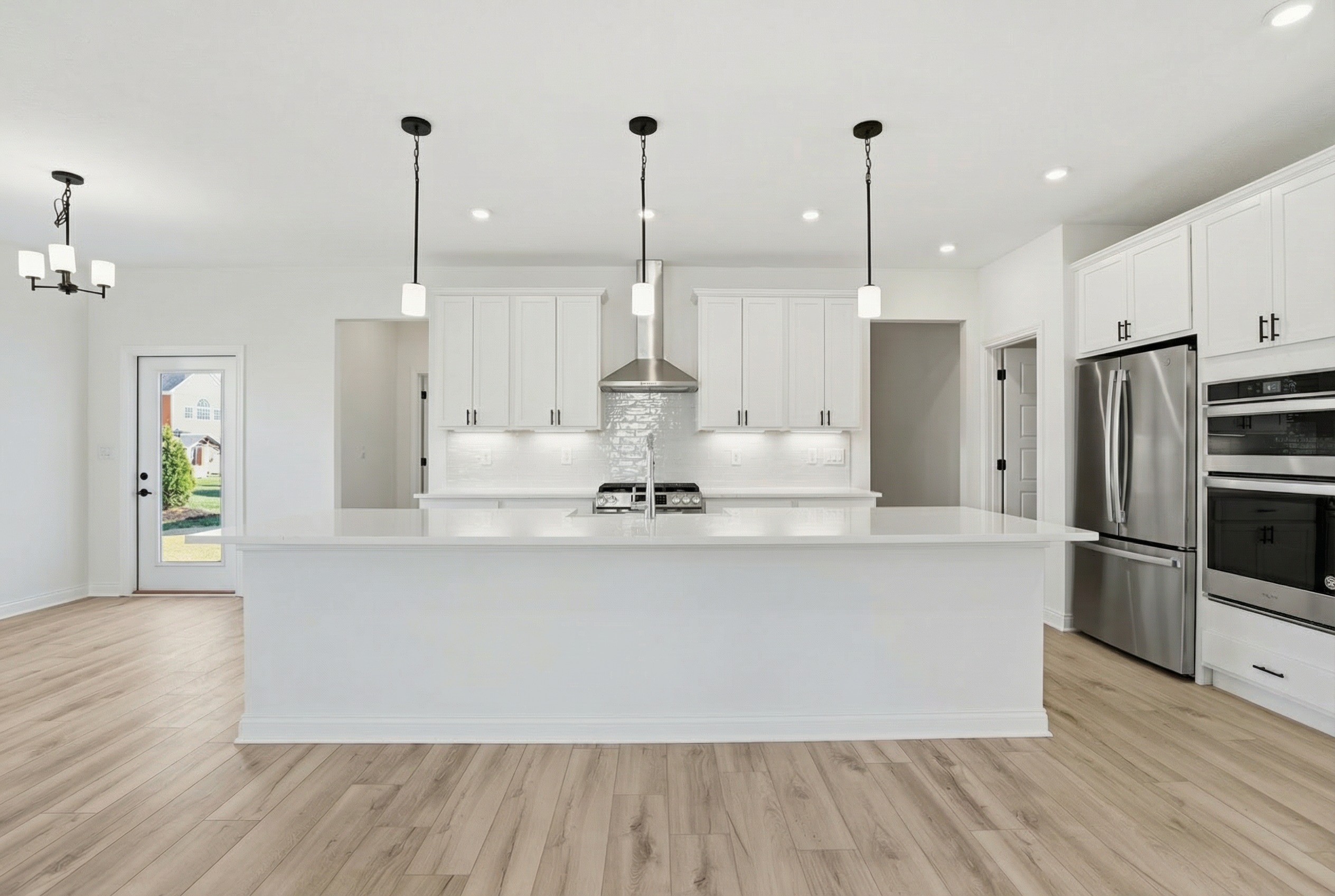 keep everything the same but change the tile backsplash to daltile mesmerist trance hexagon change the cabinet pulls to champagne bronze and change the lighting to champagne bronze the pendants should be a glass globe style