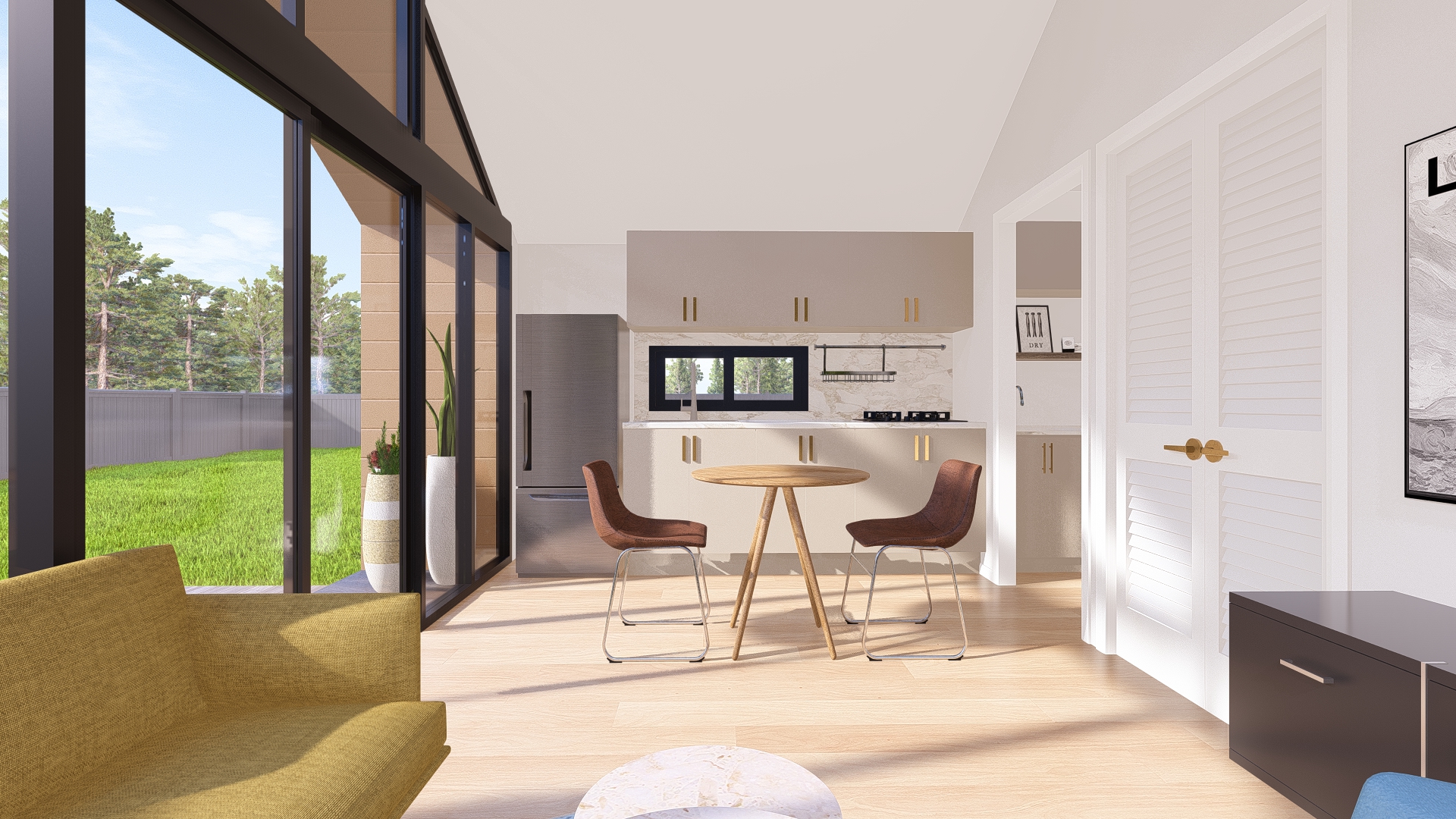 this is a bungalow granny flat interior showing the kitchen in taupe laminate cabinets a 2 seater dining set and a sleek stainless refrigerator in the foreground is a cropped view of a sofa nesting center table and console table the interior is filled with natural light flooding in from the left glass wall add some recessed pin lights in the ceiling as well to make it look more realistic