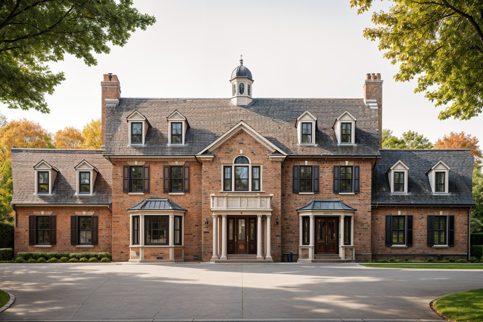 exterior shot exterior shot of a georgian revival home with brick walls slate roof and black shutters landscaping in front of home