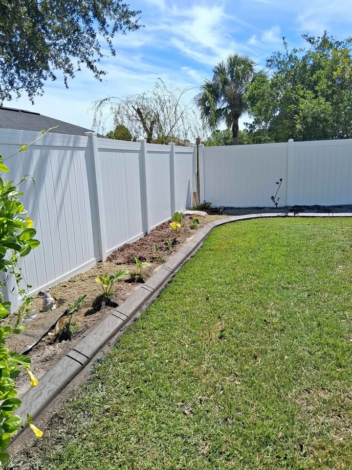 a serene backyard scene with a white wooden fence bathed in warm sunlight the sky is vibrant with soft wispy clouds painted in gentle blues and whites tall palm trees in the backdrop display lush green leaves the ground is rich with fresh green grass and a garden bed with small plants showing tender leaves and a few bright yellow flowers the atmosphere is peaceful capturing the tranquility of a sunny day