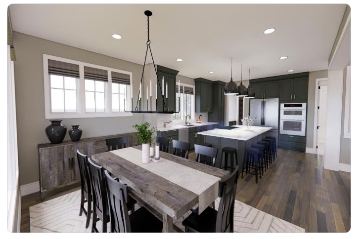 change the brick color to us make the kitchen cabinets white shaker style with crown moulding change the island cabinets to brno manufacturer blue color change the countertops in kitchen and island to acadia gold quartz change the flooring to audacity symphony lvp elton color change the kitchen island pendants to progress celino style gold color