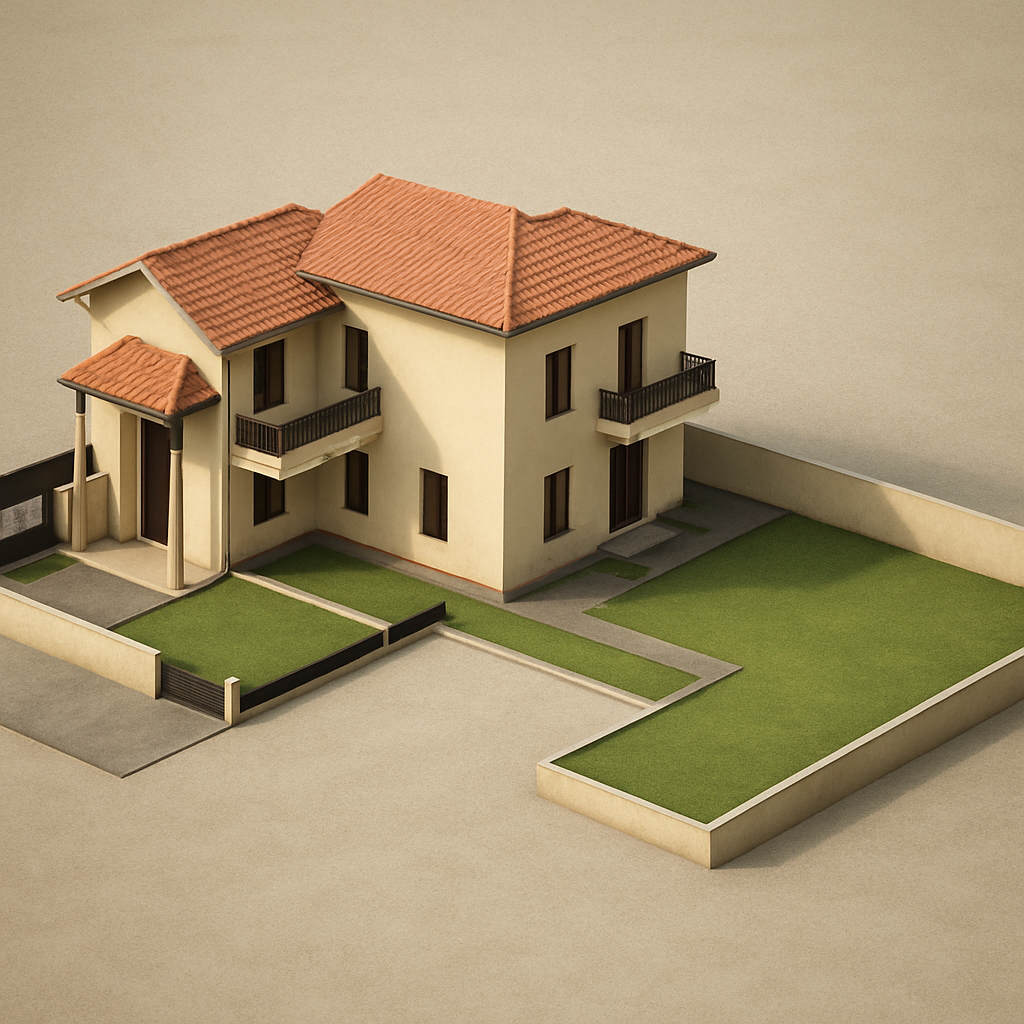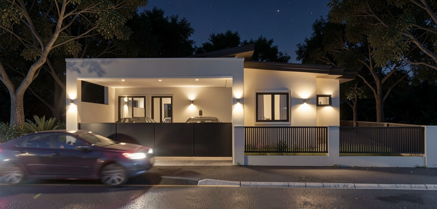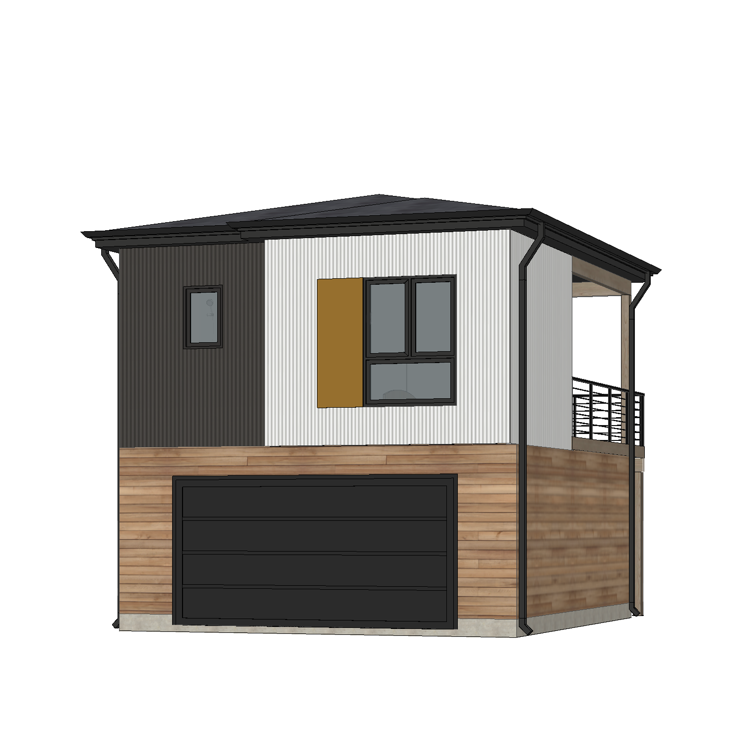 laneway suite set in a back alley with neighbouring garages either side and a concrete driveway sunny day