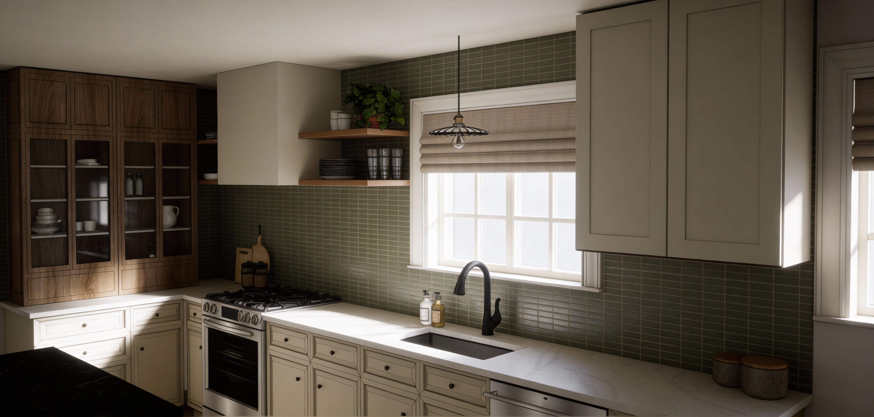 render this cad drawing with dark green paint a black metal roof black window trim there are 6 windows