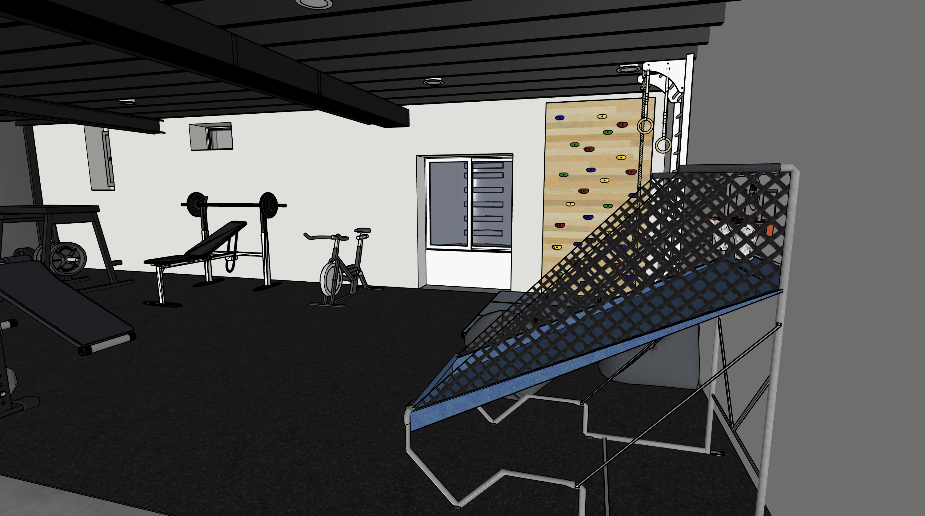 render as shown black ceiling rafters natural light from egress window no other windows light from ceiling lights