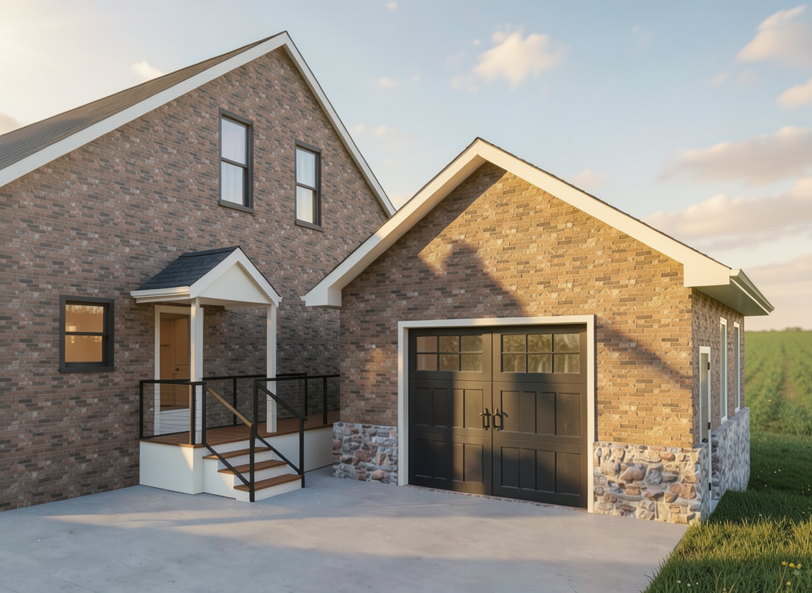 make more real materials natural light condition and lidgt grey roof surroundings grass and trees central europe style