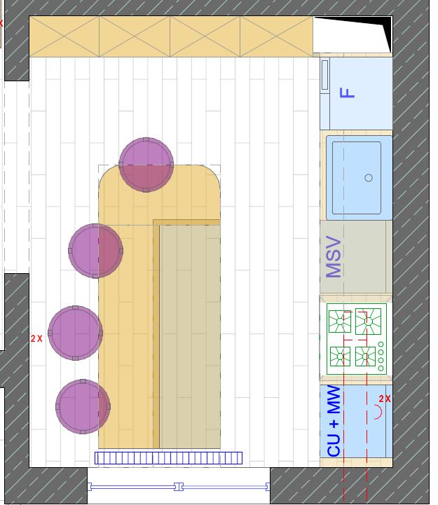 a modern kitchen l shaped kitchen on the left there is a dish display case on the right is a the kitchen and we have the appliances in this order from left to right frigde sink with faucet a countertop with a dish washer under the cooking stove with a hood above it the built in oven that is above the countertop the lower cabinets are black the upper and suspended cabinets have door fronts that have black frames with glass in the middle of the kitchen area next to the wall with the window there is an island made of a high bar of 120 cm with 4 stools on one side the countertop of the bar is finished with wood natural finish on the other side of the bar there is a lower 90 cm countertop used as a worktop the floor is hardwood floor natural finish