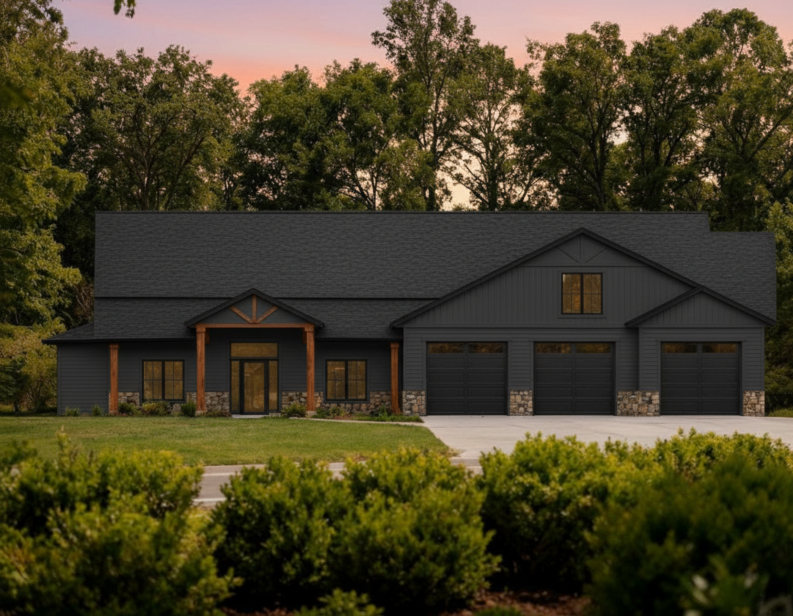 keep background make siding and trim light grey with black windows and shingles grey wood tone columns and garage doors white ledgestone