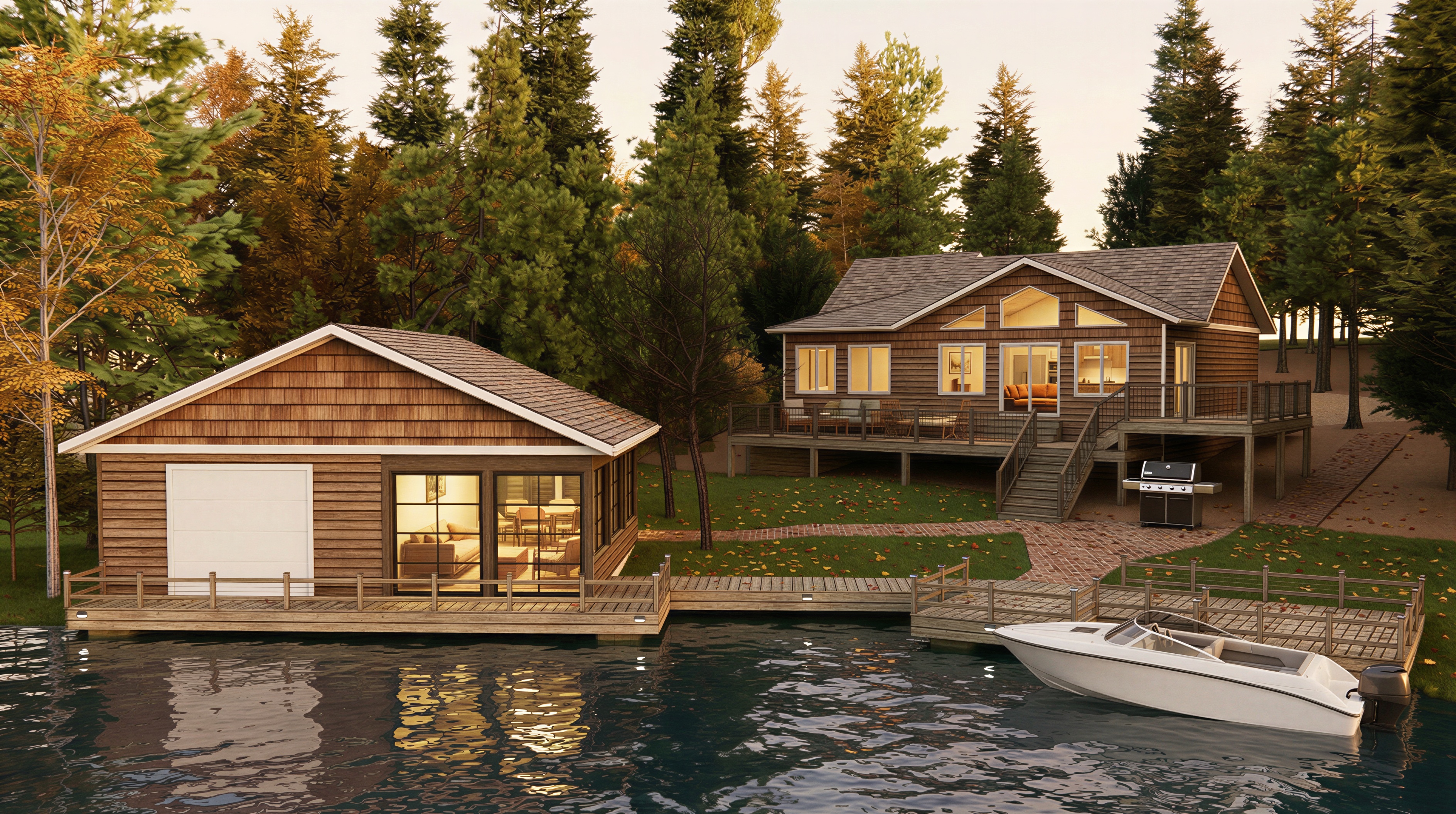show tv fireplace on the left side of the living room seen through the windows of the cabin make the entire back facade of the cabin the same dutch lap siding