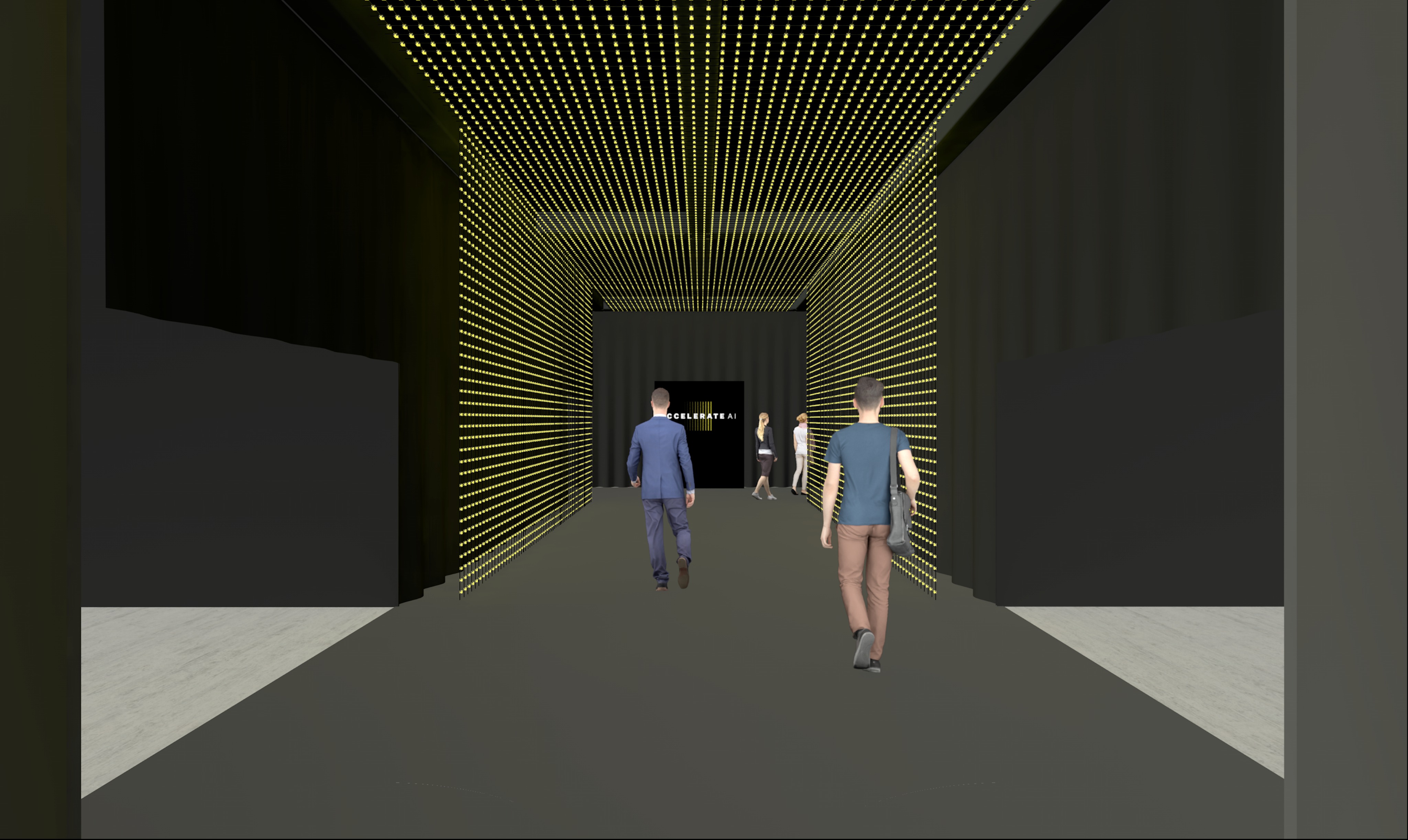 realistic dark entry tunnel to expo environment slightly with yellow lighting business people walking toward the end of tunnel