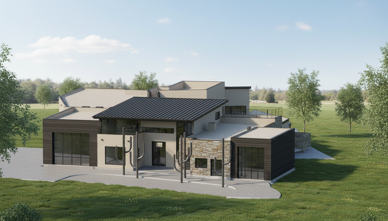 the very left mass of this building is cladded in wood it is a garage the mass to the right of this building that has a patio above it and a big picture window is covered in stucco i have attached a moodboard with the exterior materials please apply the stone ledge only onto this mass keep the main center mass with the entry door stucco do not change anything else on the structure except for replacing the stucco with the stone ledge there are only 2 exposed walls that can be seen from this angle that will have the stone ledge