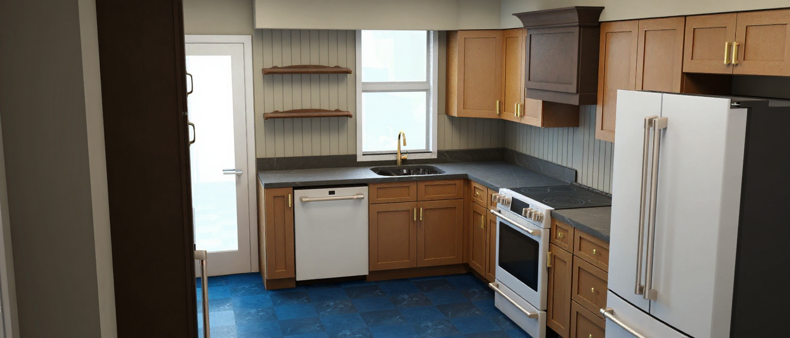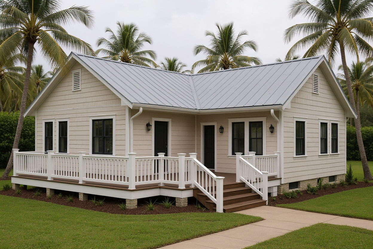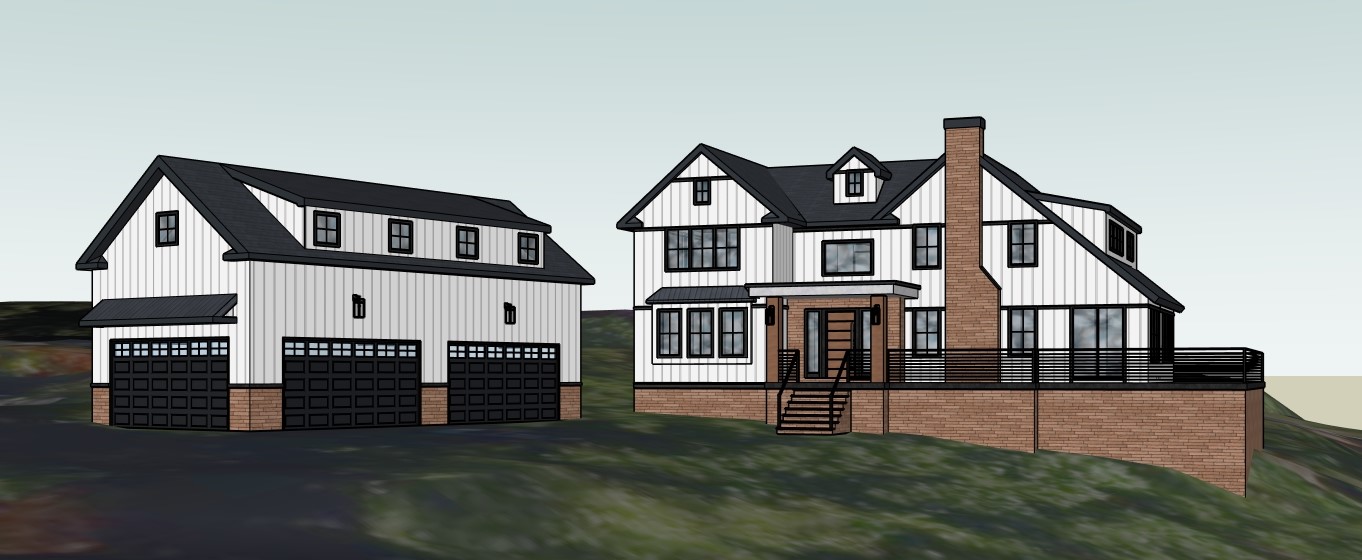 render with a contemporary design dark slate roof modern dary grey board and batten siding and light brick at the base modern farmhouse style warm sunny day with some trees in the distance show a walkway leading up to the front steps and show a driveway leading up to the garage