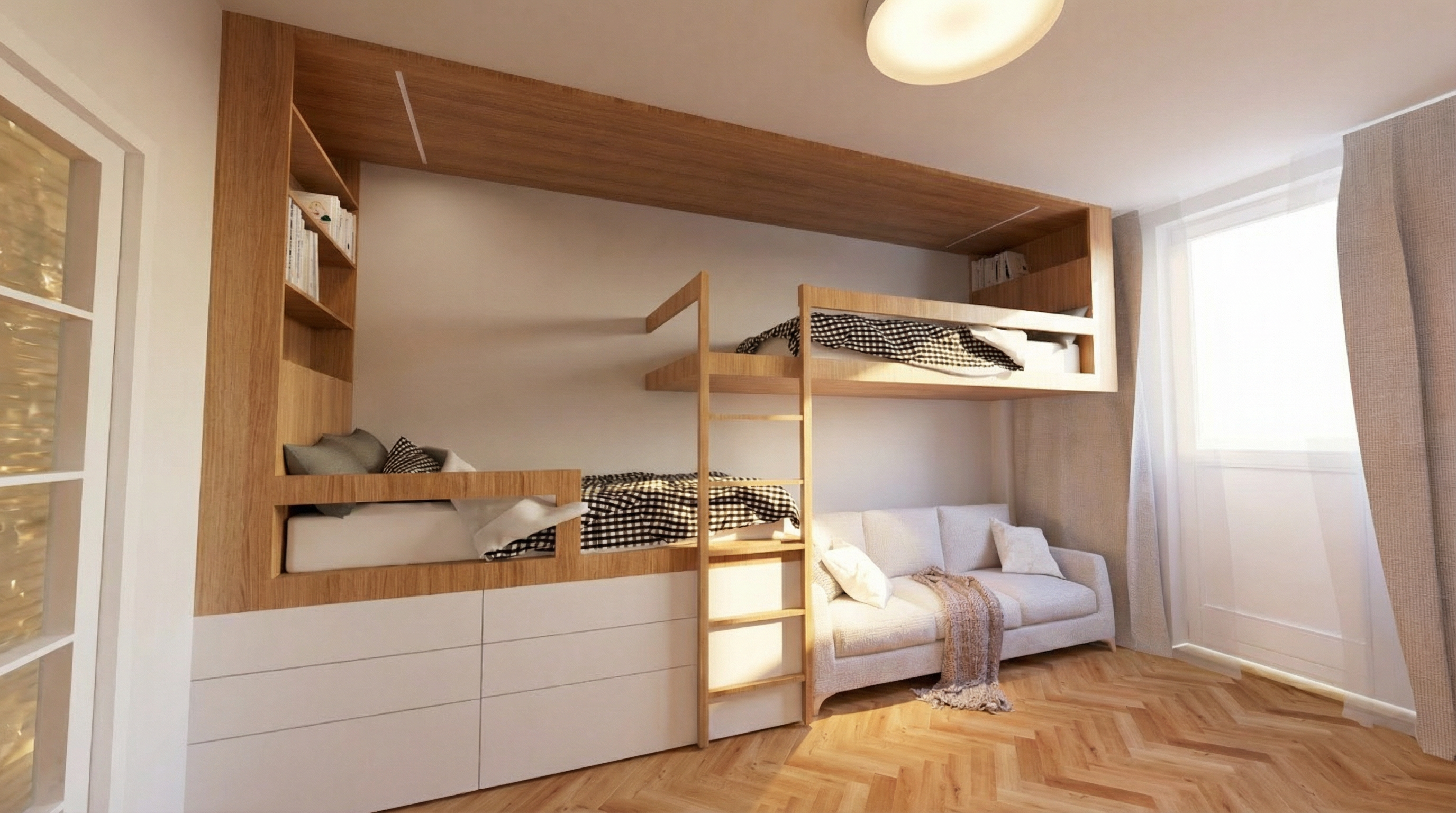 do not change anything in the existing image except the wall area centered above the bed keep the bed furniture lighting colors materials camera angle and atmosphere exactly identical on the wall centered above the bed add a sculptural wall installation composed of vertically suspended translucent orange glass elements each element is an elongated rounded rectangle slightly irregular with a hand cast glass texture the glass color ranges from warm amber to deep burnt orange semi transparent with subtle internal bubbles and texture the elements are aligned in a precise vertical rhythm evenly spaced forming a calm architectural composition the installation is strictly centered on the bed axis and occupies a limited horizontal band above the headboard