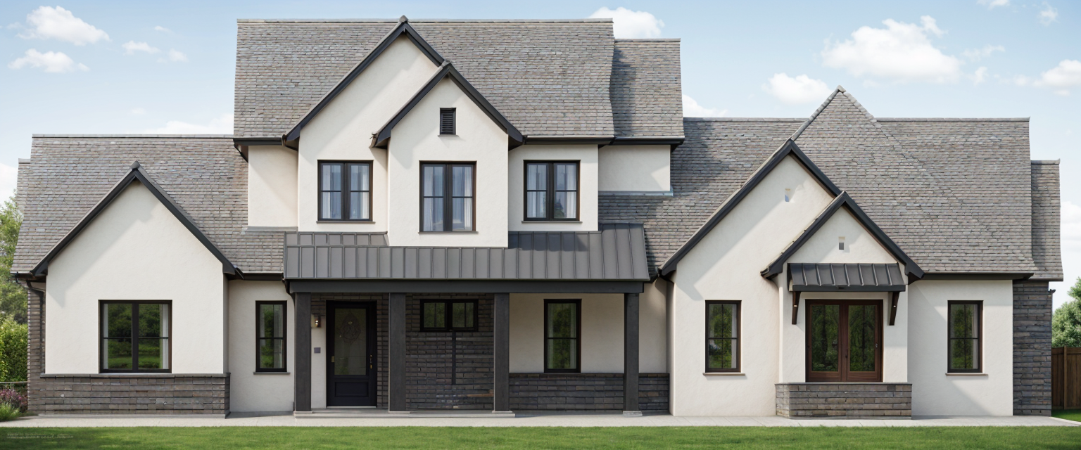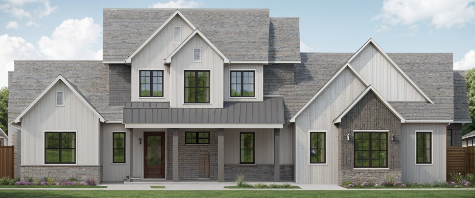 exterior shot the canopy in the front of the building should be a metal trellis structure with a corten steel palette and warm wood in the facades underneath