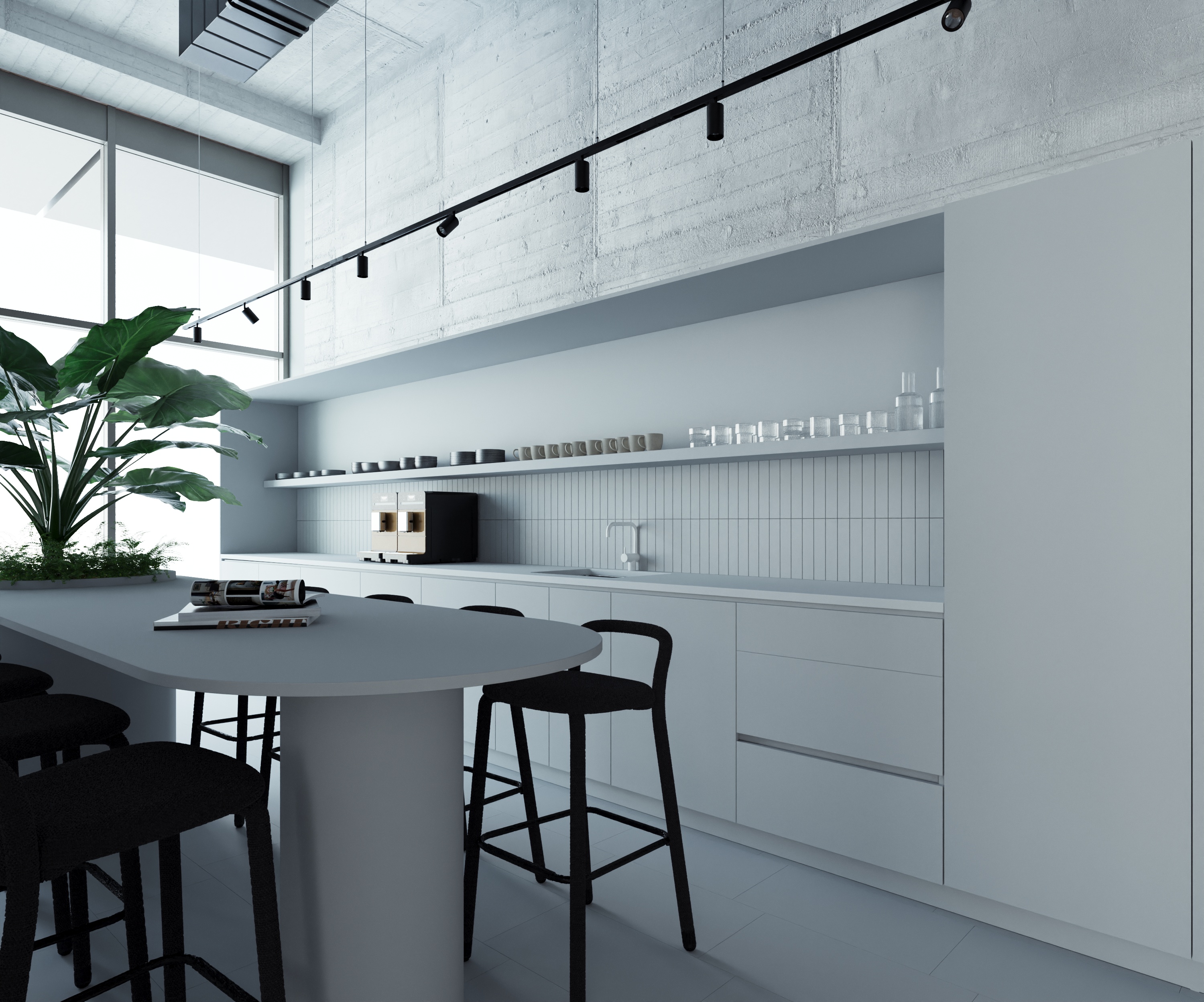 interior shot black chairs with polished aluminium legs concrete white walls and ceiling vibrant greenery make the background on the windows a street view of a corporate street