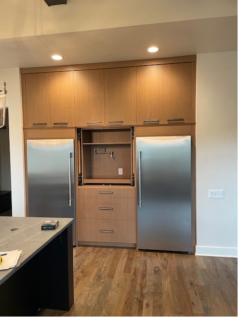 do not change the cabinets in any way preserve the exact cabinet colors materials finishes dimensions door and drawer styles hardware spacing alignment and all geometry exactly as shown do not alter the countertop shape backsplash appliances flooring lighting fixtures or wall structure only remove the construction materials clutter and mess from the scene clean the room and make it look finished and staged add a few simple tasteful home accessories appropriate for the style of the space but do not add or remove any furniture windows or architectural elements maintain the original lighting direction and realism enhance clarity and polish the photo while keeping the cabinetry and room design completely unchanged do not alter the lighting to keep the cabinet colors as they are in the image restage for a beautiful kitchen add stools to the island stage the open cabinet between the refrigerators for a coffee station do not add lights to the inside of the cabinet