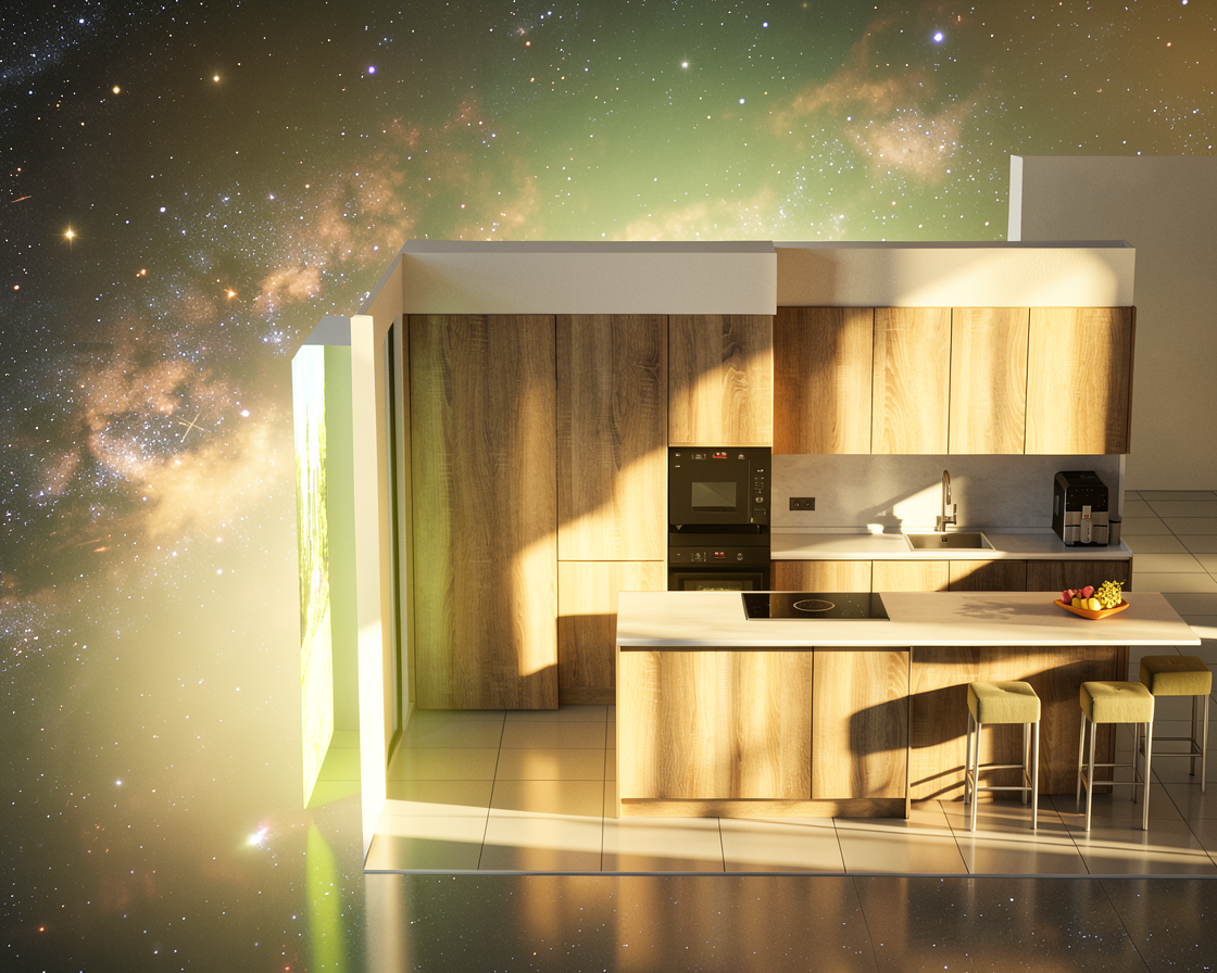 white glossy finish cabinets modern kitchen oak wood counter high detailed render moderate lightning add kitchen accessories keep original nodes