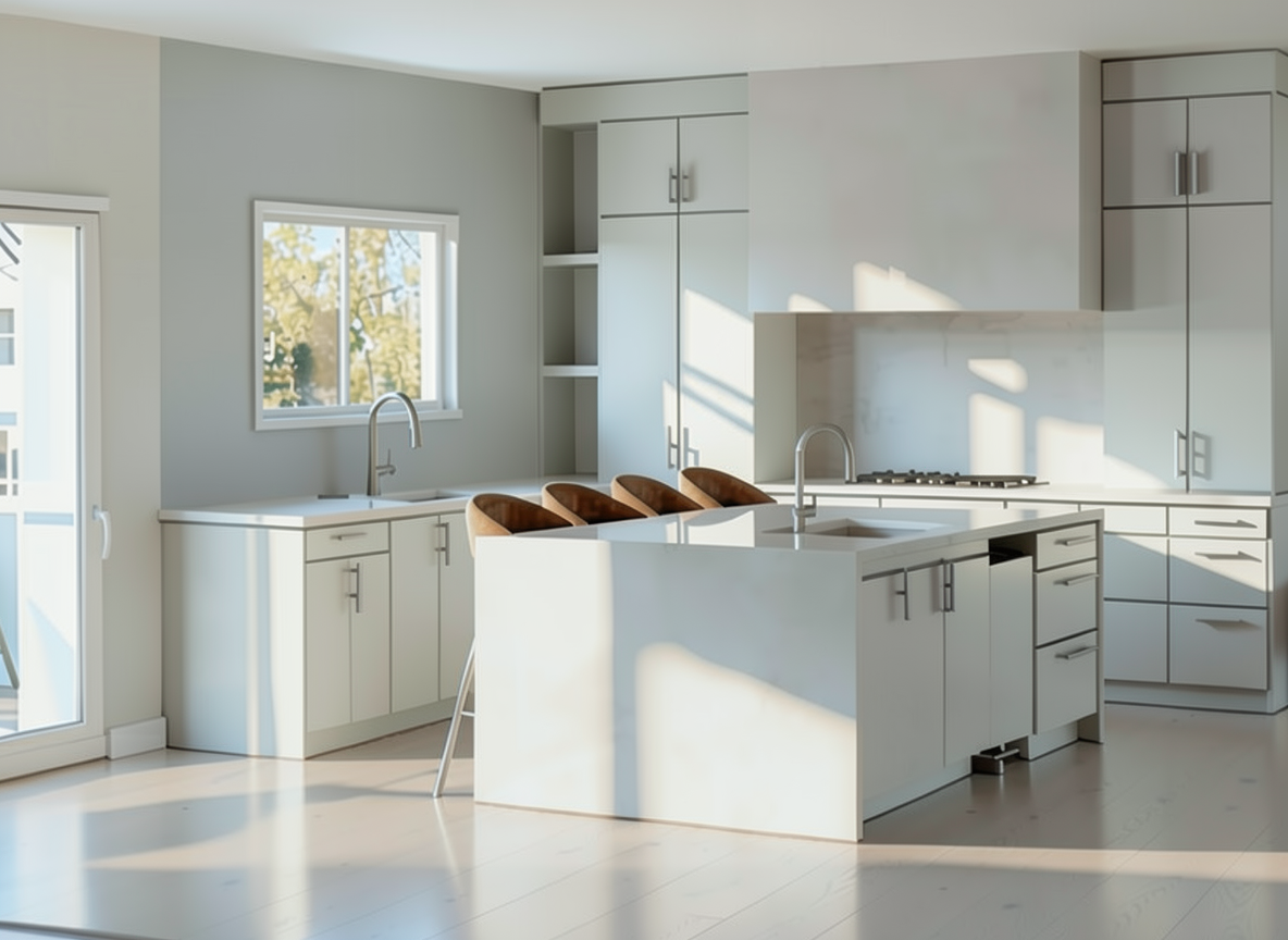 convert this floor plan into a realistic isometric 3d view of a full house show the space from an elevated angle with furniture walls and details visible isometric top down view of a modern outdoor pergola kitchen with accurate proportions and no enclosed walls the pergola has a matte black frame with visible posts and beams defining a clear structural grid inside the pergola create one dominant l shaped outdoor kitchen island the main horizontal run is long and spans most of the width between posts approximately 12 14 feet the vertical leg extends downward approximately 10 12 feet the island has consistent depth and clean 90 degree geometry the island is made of smooth coastal microcement in a warm white tone with built in open shelving niches appliances a 5 ft grill centered on the main horizontal run a pizza oven on the left end of the main run a sink integrated along the vertical leg important do not add any kitchen along the back wall do not create additional kitchen zones only one l shaped kitchen add a secondary element a long narrow rectangular prep and seating surface placed parallel to the main run minimal thickness clean slab form used for both prep and seating approximately 8 10 feet long floor existing poured concrete slab soft gray tone slightly imperfect texture no tile pattern environment open air structure no walls no rooms maintain clear walkways around the island style minimal mediterranean coastal architectural clean monolithic forms no bulky cabinetry use the same furniture as shows on the plan do not change the orientation of the floorplan